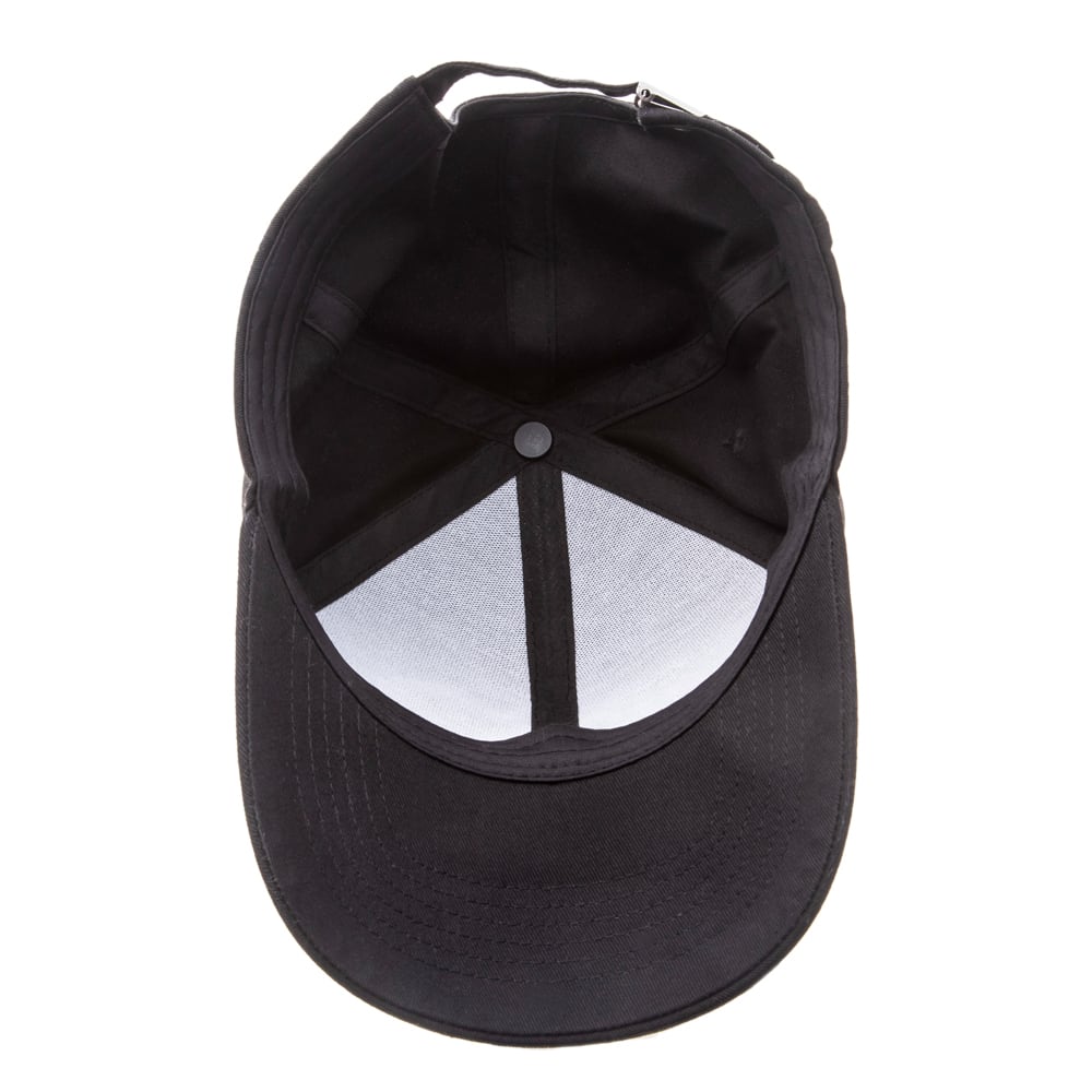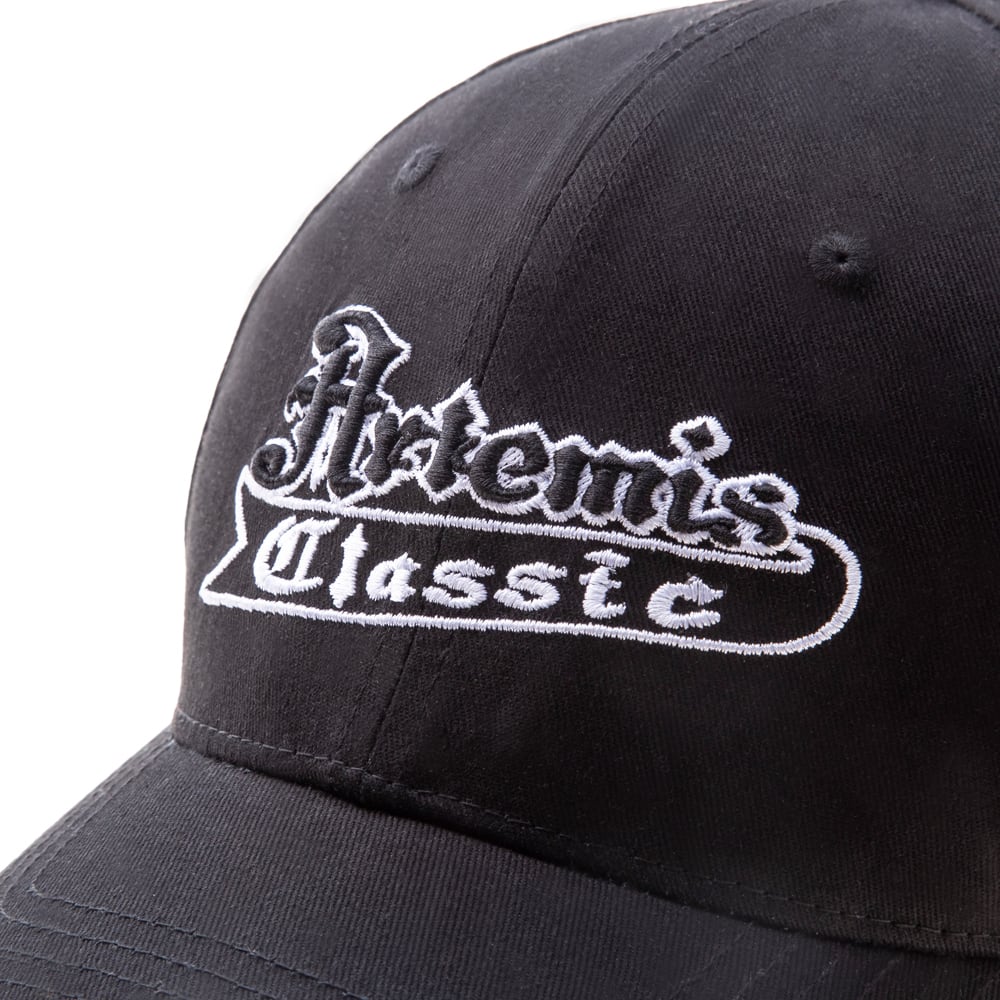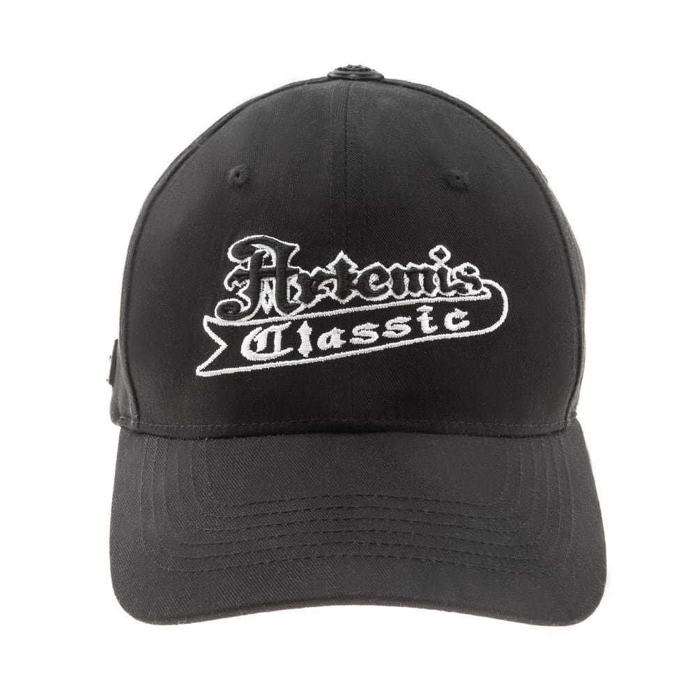 A considered take on the black baseball cap, elevated by ribbon-style logo embroidery at the front. On the right side, an openwork square AC-monogram metal piece adds a sculptural glint; the left side is finished with a woven brand tab, and the crown is topped with a round AC-monogram concho—detailing that reads beautifully from every angle. A well-proportioned crown and balanced brim refine the profile, while the depth of the black fabric contrasts elegantly with the cool sheen of metal.