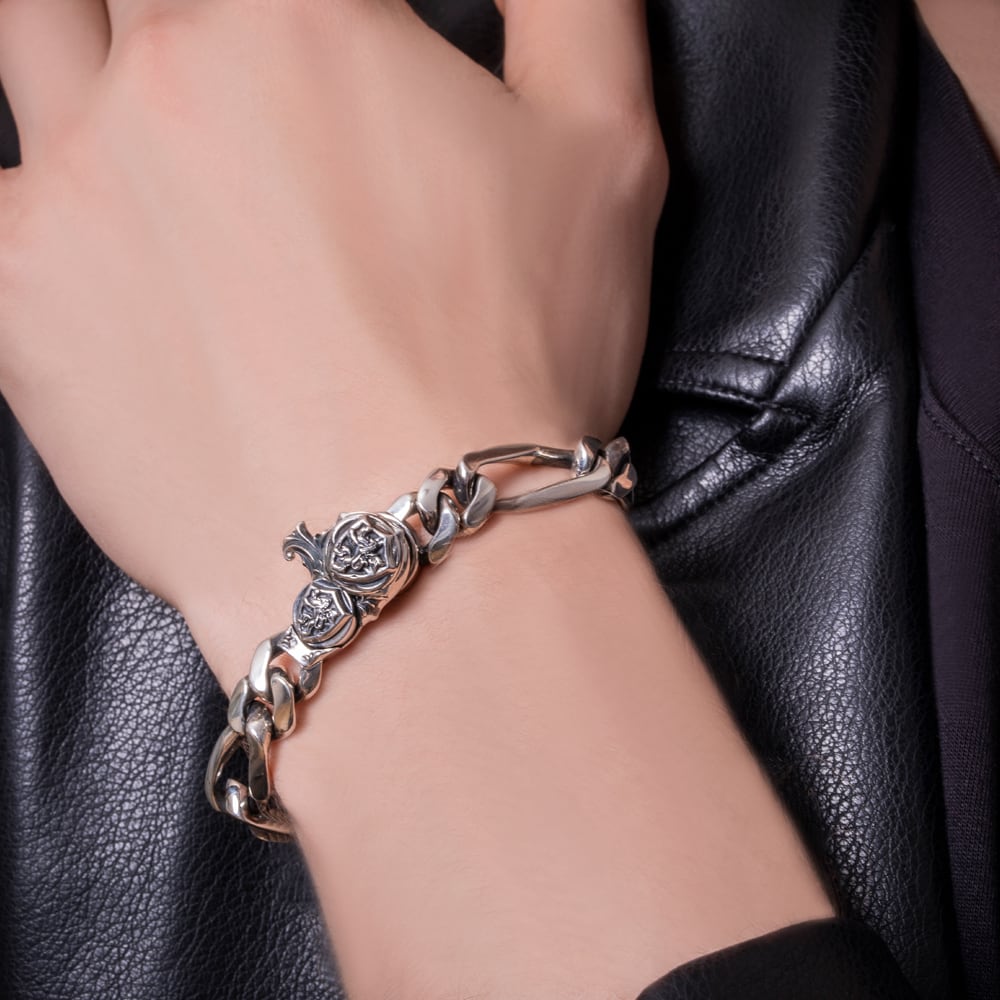 Limited to 100 pieces—each individually numbered. This Figaro-link bracelet distills sterling silver to its most confident form, delivering a purposeful weight and impeccable shine. The snap-hook clasp is crowned with a sculpted lion shield, a quiet emblem of strength rendered with gothic poise. Mirror polish meets subtle antiquing to draw layered light and shadow across every facet, while the clean, modern silhouette stands alone or stacks with effortless authority. On the reverse, the hallmark, AC signature, and .925 are engraved; along the clasp side, “Limited Edition” and a unique serial number affirm its rarity. Crafted under brand supervision at our partner atelier with meticulous savoir-faire, it’s a piece designed to be worn, admired, and kept.