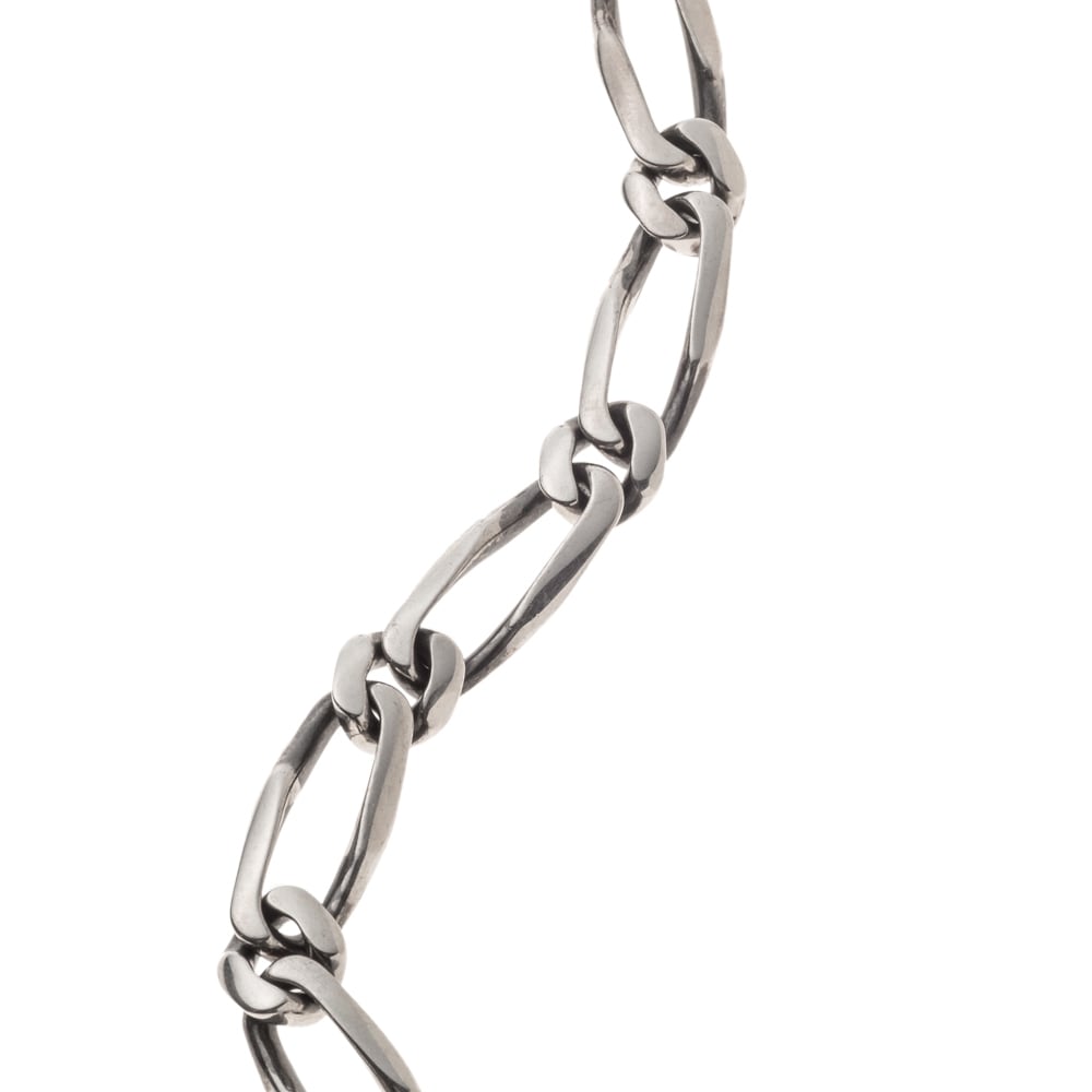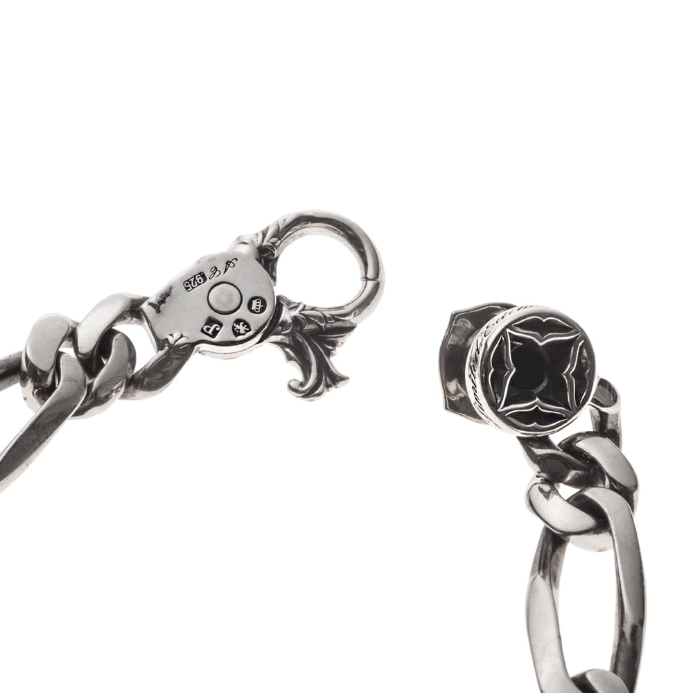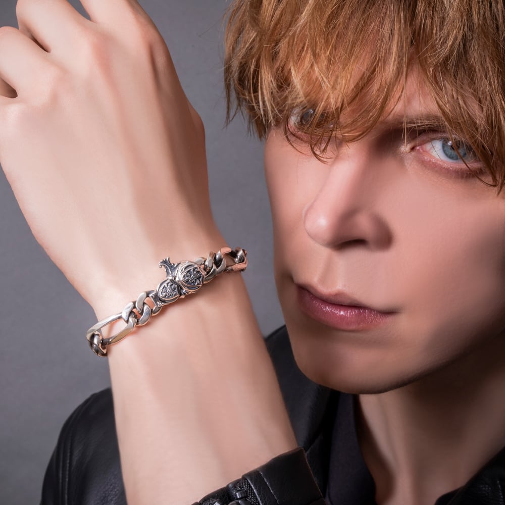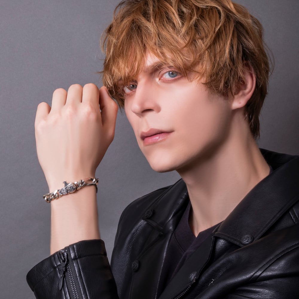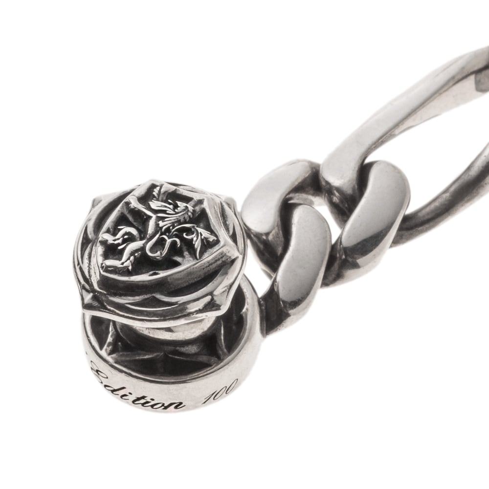 限定100本、各本体にシリアルナンバーを刻む特別仕様。重厚なフィガロチェーンの魅力を研ぎ澄ませた、SV925製ブレスレットです。脱着はナスカン式。留め具にはライオンシールドの紋章を立体的に彫り上げ、手元に静かな威厳を宿します。鏡面の艶と控えめな燻しが光と影のレイヤーを描き、シンプルでモダンなチェーンは一本でも重ねても端正に成立。適度なボリュームと心地よい重量感が所作を凛と整え、装いの完成度を一段引き上げます。ナスカン裏にはホールマーク・AC・〈925〉の品質刻印、サイドには“Limited Edition”と個別番号を刻印。ブランド監修のもと、提携アトリエ工房の熟練の技で丹念に制作しました。銀の瑞々しい輝きを永く楽しめる、自信作です。