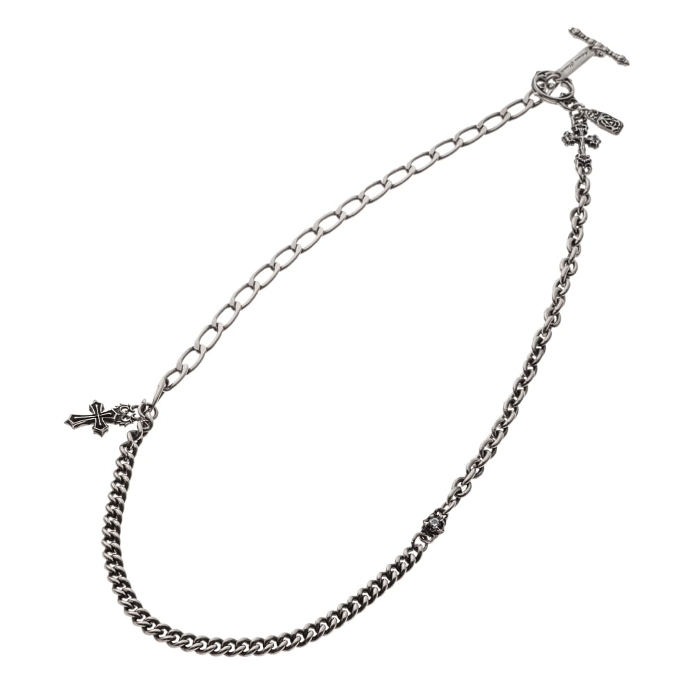 三種のリンクが奏でるリズムを手首に。喜平・アズキ・ロング喜平を精密なバランスで組み合わせた、二重巻きのシルバーブレスレットです。Tバーでスマートに着脱でき、二つのクロスチャームが揺れるたびに艶を放ち、クリアCzを抱くイニシャルボールが潔い光をひと差し。微細な彫り込みと燻しの陰影が質感を深め、SV925の澄んだ輝きと程よい重みが、細身ながら確かな存在感を生み出します。プレートにはロゴとホールマーク、〈925〉を刻印。ダブルラップの立体感が手首を包み、時計や他チェーンとの重ねでも品よく調和します。ブランド監修のもと提携アトリエ工房のサヴォワフェール(職人技)で丹念に制作。白Tからテーラードまで装いを選ばず、日常を一段と洗練へ導く、長く愛せる一本。