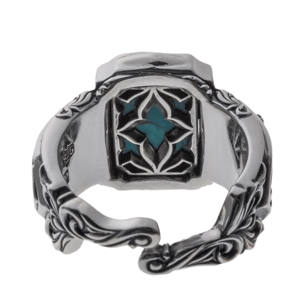 This sculptural signet layers an open-worked “AC” monogram over an amazonite-hued marble inlay, letting sea-green translucency catch and release the light. Clear CZ stones punctuate each shoulder with a refined glint, while classical tracery and arabesque motifs continue around the gallery and underside—beauty considered from every angle. Cast in sterling silver and finished with a mirror polish and subtle antiquing, it bears our logo hallmark and “925.” From material selection to hand finishing, the atelier’s savoir-faire delivers a ring of timeless poise and reassuring weight. Wear it solo as a statement, or stack with minimal bands for a modern contrast. Unisex, adjustable, and gift-ready.