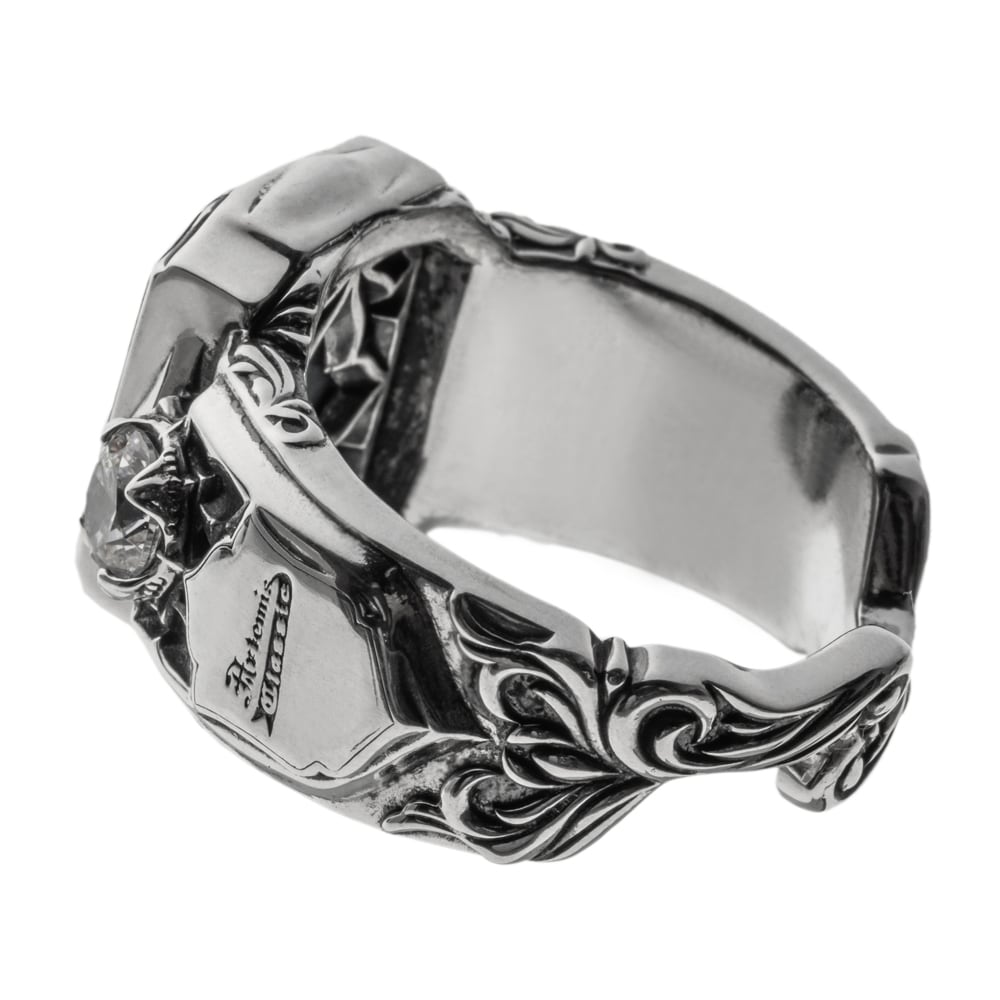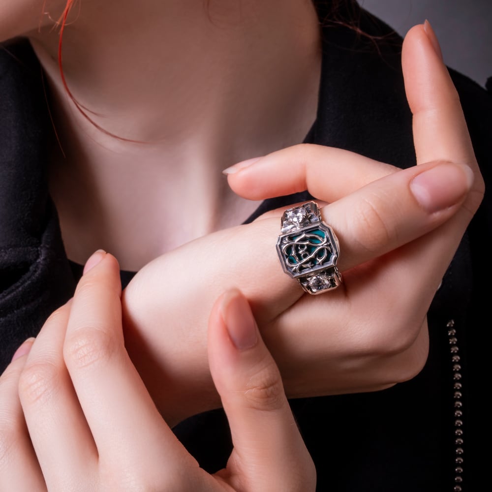 唐草風の透かしで描いた「AC」イニシャルの下に、アマゾナイトカラーのマーブルを敷いた印台リングです。青緑の透け感が光を取り込み、鏡面と燻しのコントラストが彫刻的な奥行きを演出。両脇にはCzクリアを品よくセッティングしました。側面から裏面までクラシカルなトレサリーと唐草の意匠を施し、見えない部分まで美しい仕立て。SV925にロゴ・ホールマーク・「925」刻印入り。厳選された素材と丹念な研磨まで、一貫したクラフトマンシップが永遠の品格を叶えます。重厚で指馴染みの良いフリーサイズ。単体はもちろん、ミニマルなリングとのレイヤードでも存在感を保ち、スタイルに確かな核を与えます。ユニセックスでギフトにも最適です。
