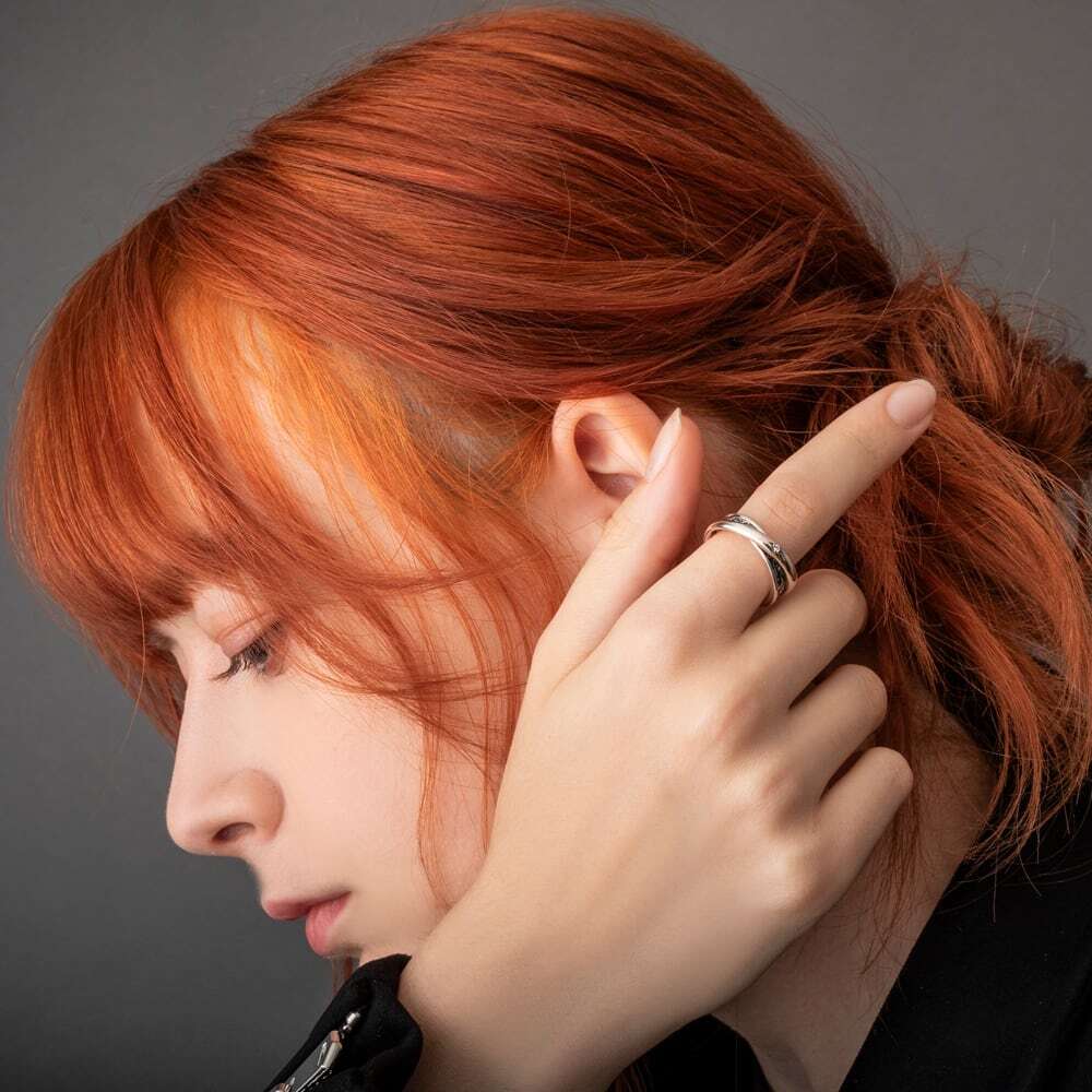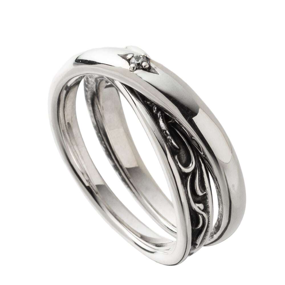 二本のラインが流れるように交差し、指上で∞を描くダブルラップリング。鏡面仕上げのバンドと、燻しで陰影を効かせた唐草エングレービングのバンドを重ね、光と影のレイヤーが織りなす上質な立体感を生み出します。頂には星留めのクリアストーンを一粒。控えめな輝きが曲線美を凛と引き立てます。内側は滑らかで装着感は軽やか。ほどよいボリュームが指をすっきり見せ、一本でも、細身リングとのレイヤードでも美しく調和。∞は“永遠・絆”の象徴で、節目のギフトにも最適です。素材はSV925。ブランド監修の下、提携アトリエが匠の技で緻密に仕立てた渾身のアートピースです。男女でペアもお薦め!連なる∞がふたりの絆をいっそう豊かに描きます。ユニセックスで、日常からフォーマルまで装いを洗練へ導く一作。