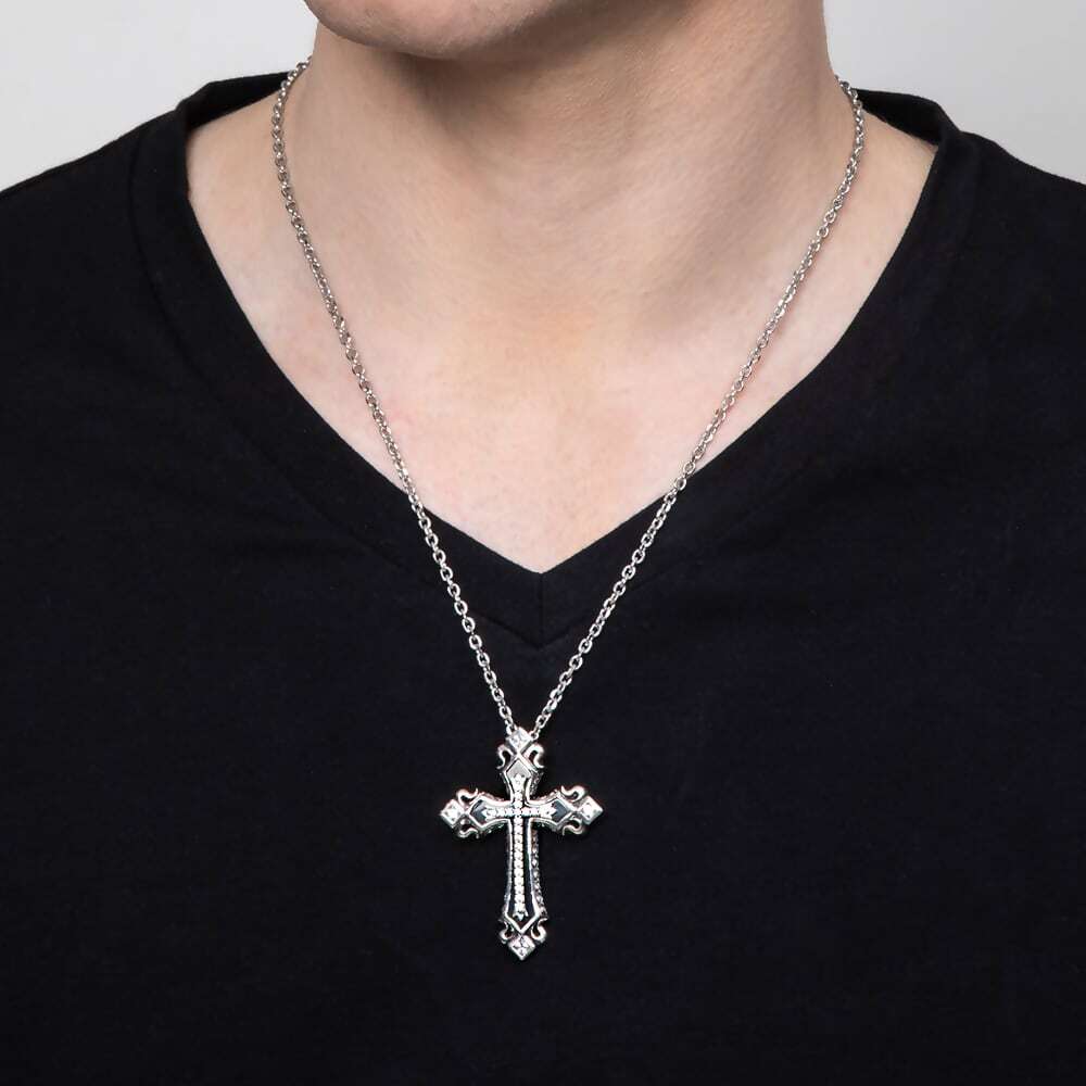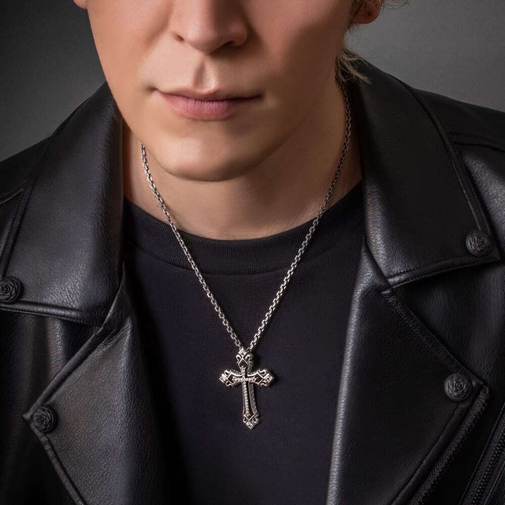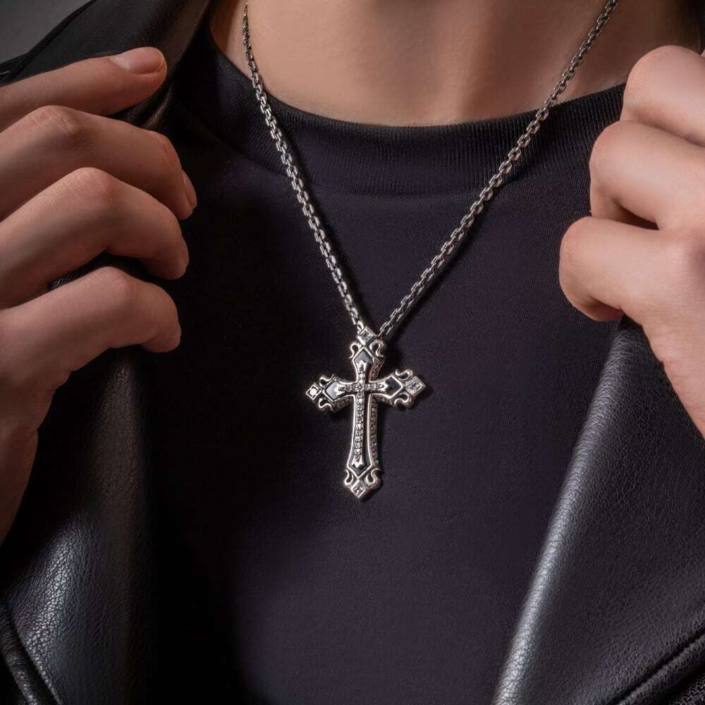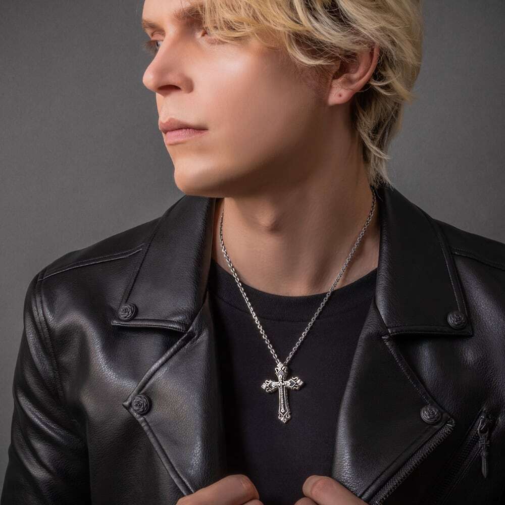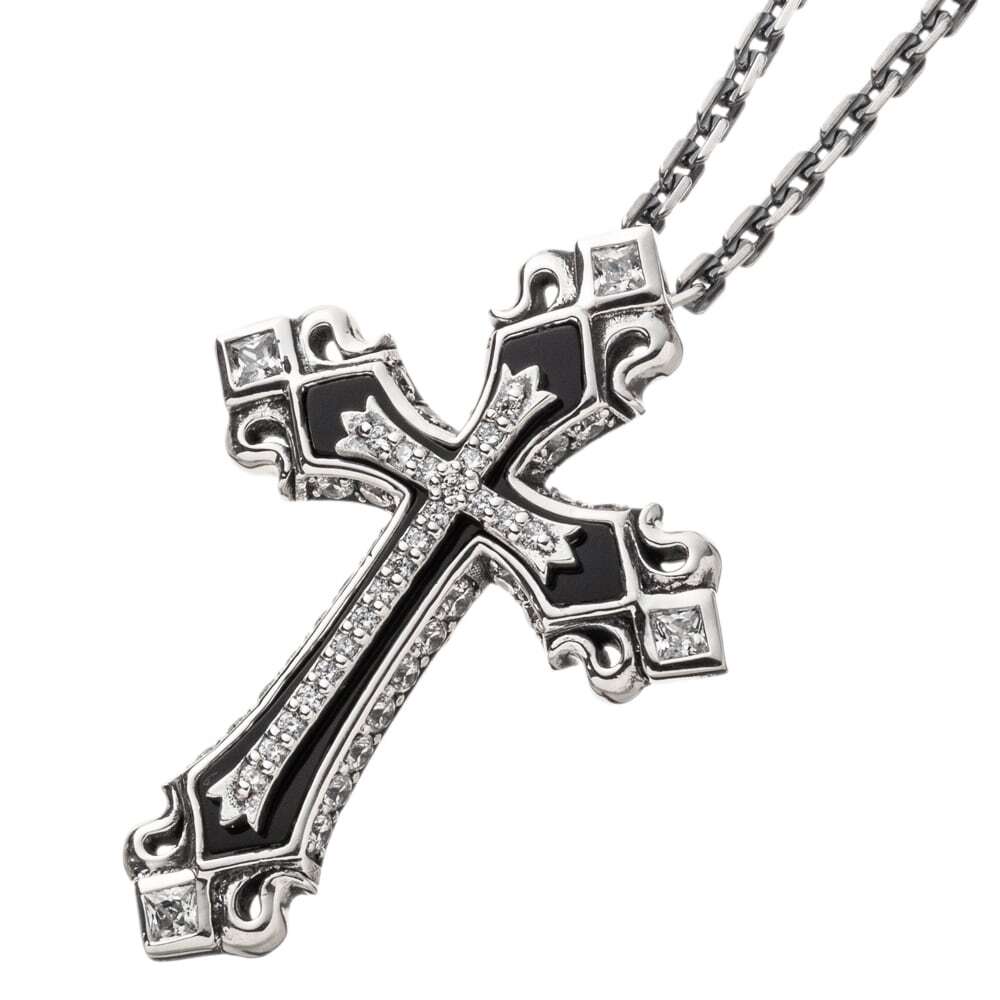白と黒のコントラストで存在感を描く、ラージサイズのクロスペンダント。鏡面仕上げのSV925が放つ艶やかな輝きに、漆黒のシンセティックオニキスを組み合わせ、中央のクロスには誕生石とCZクリアのパヴェを配置。光が差し込むたび、静謐なモノトーンの中に凛とした煌めきが浮かび上がります。四隅の装飾まで計算されたゴシック調のフレームは、陰影が美しく立ち上がる立体設計。銀の贅沢な重みと、しっかりとした重厚感がありながら、装着感は快適。背面にはキリスト像の繊細なレリーフ、ロゴと“925”の品質刻印、リミテッドのシリアルナンバーを配し、見えない面まで品格を追求。ブランドの意匠を体現し、提携工房が精緻に紡いだクリエイションです。Tシャツからジャケットまで装いを引き締める、アートピース級の一本。※ペンダントトップのみ(チェーン別売)。