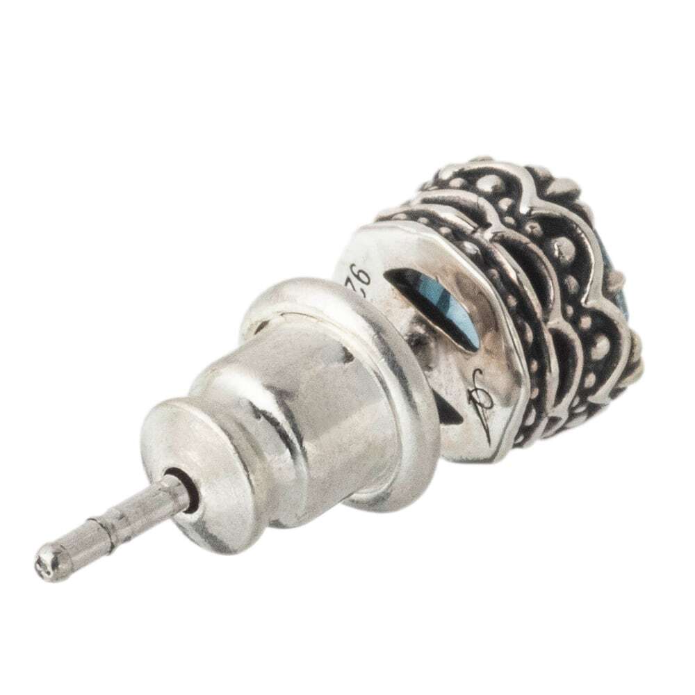 宝石の光を耳元に。天然宝石をラウンドブリリアントでセッティングした、ミニマルで研ぎ澄まれた一粒ピアスです。石座は王冠を思わせるクラウンベゼル。粒飾りと唐草の細密な彫り、燻しの陰影が宝石の蒼をいっそう深く引き立てます。爪の角度や石座の高さまで緻密に設計し、光を最大限に取り込むプロポーションに。小粒ながら凛とした存在感で、Tシャツにもテーラードにも自然に溶け込むユニセックスな一本。滑らかな装着感と安定感のあるキャッチで、日常使いも快適です。地金はSV925。銀の燻しと艶のエイジングのコントラストがさりげなく品格を添えます。ブランドの思想を、提携アトリエの匠が具現化したプロダクトです。さりげないのに印象的──日常を格上げする、小さなアートピースピアスです。 縦:6.5mm 横:6.5mm 厚:4mm 重:0.9g 素材:SV925 ロンドンブルトパ シリコンキャッチ 片耳分 付属品:BOX、ギャランティーカード、ショッピングバッグ