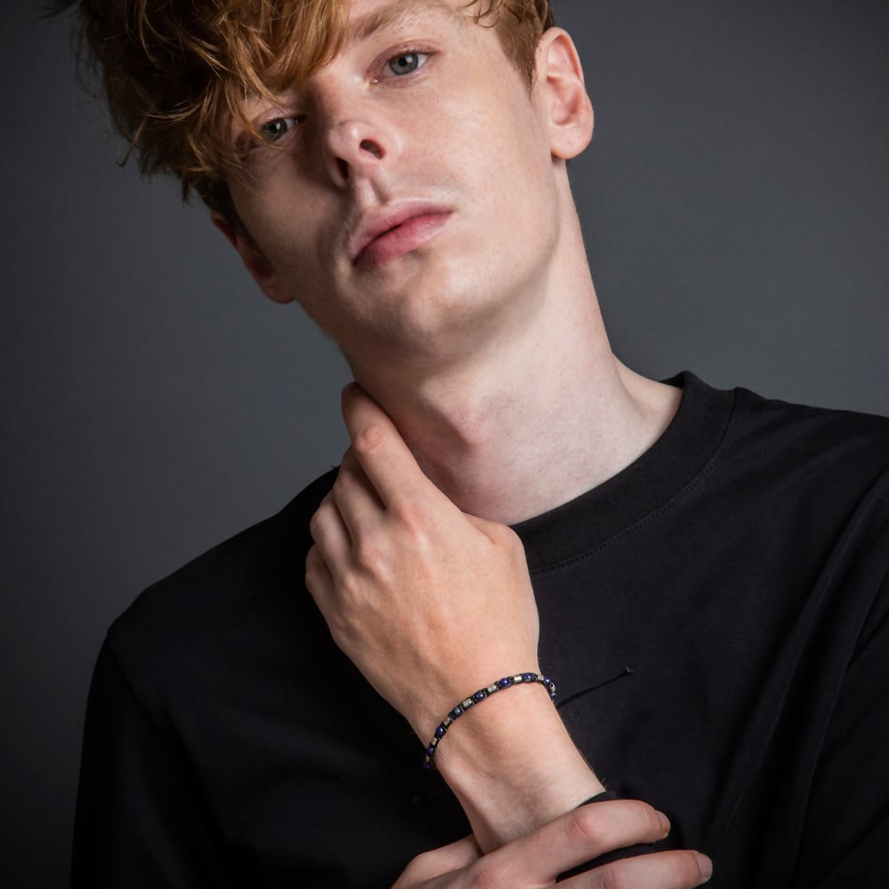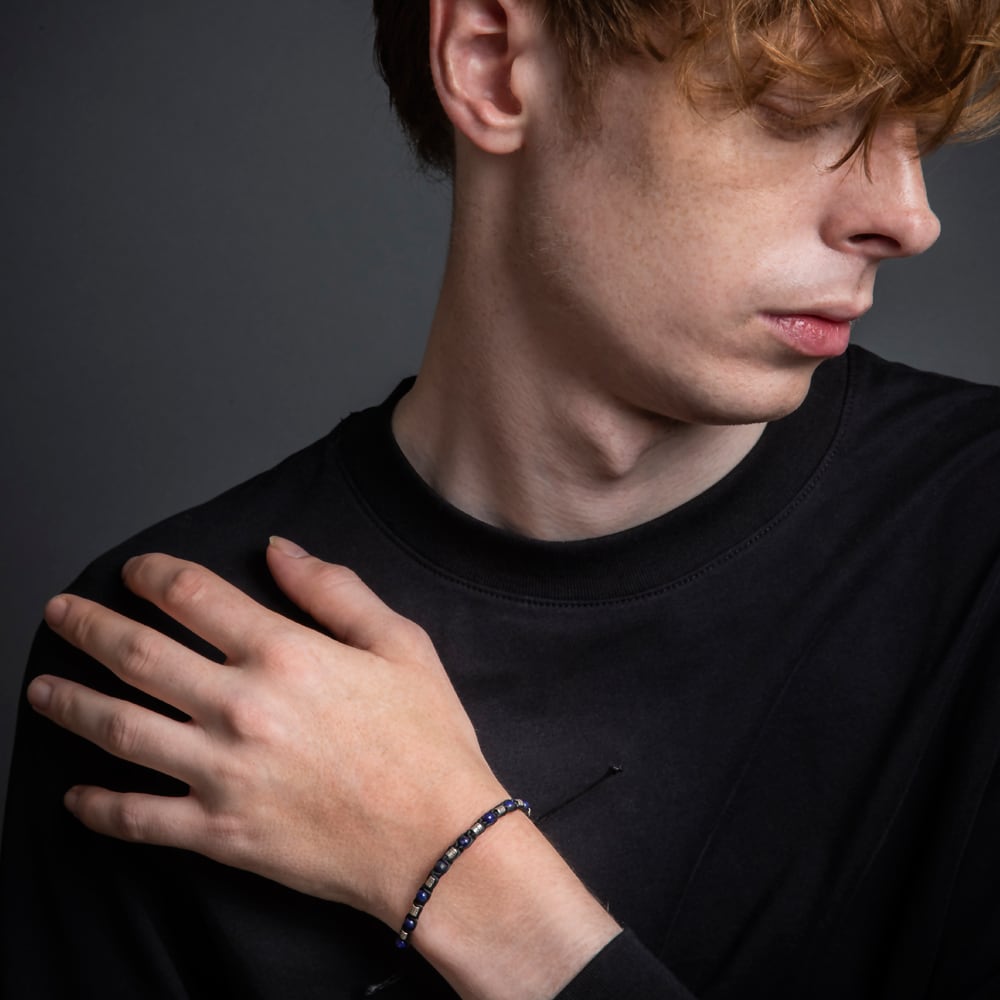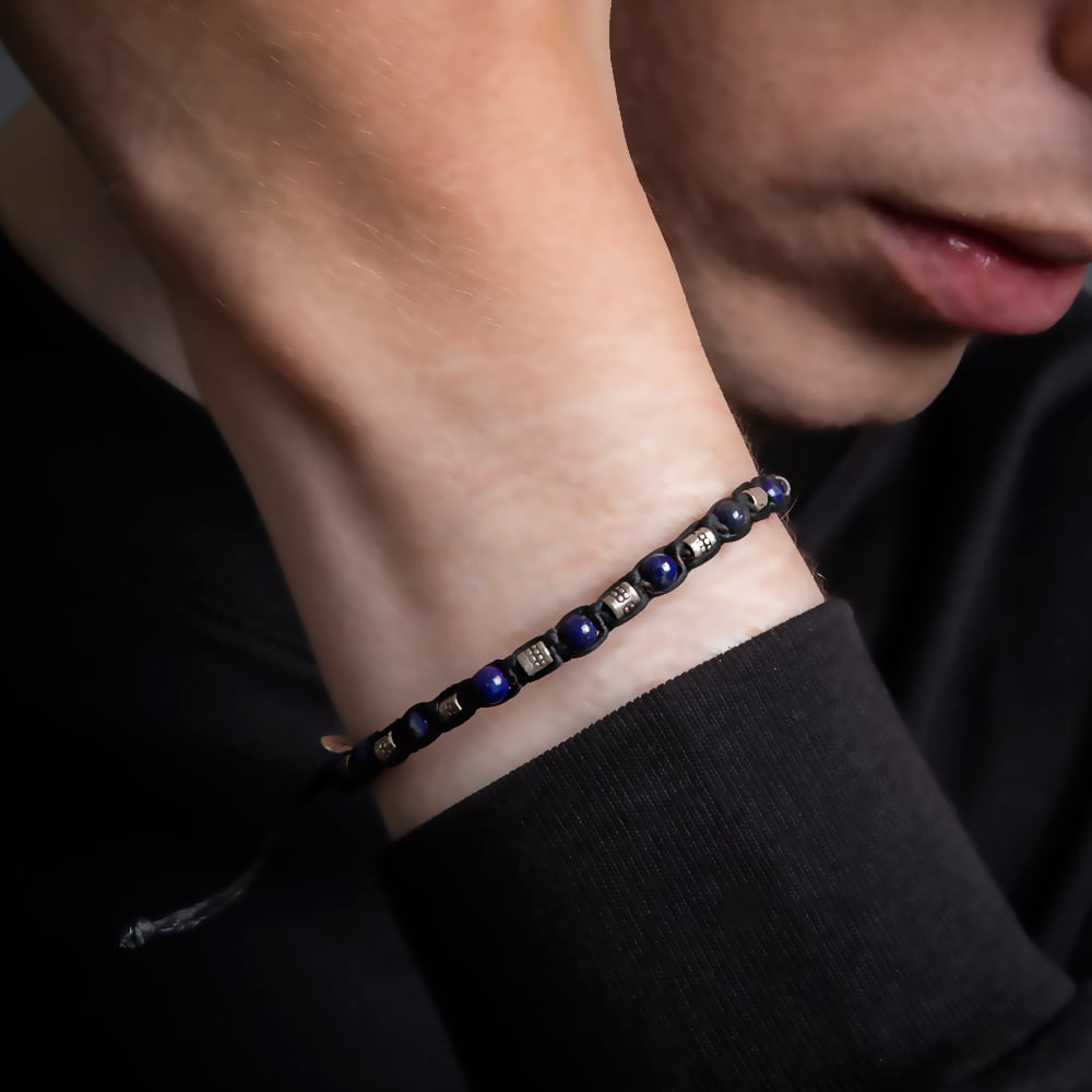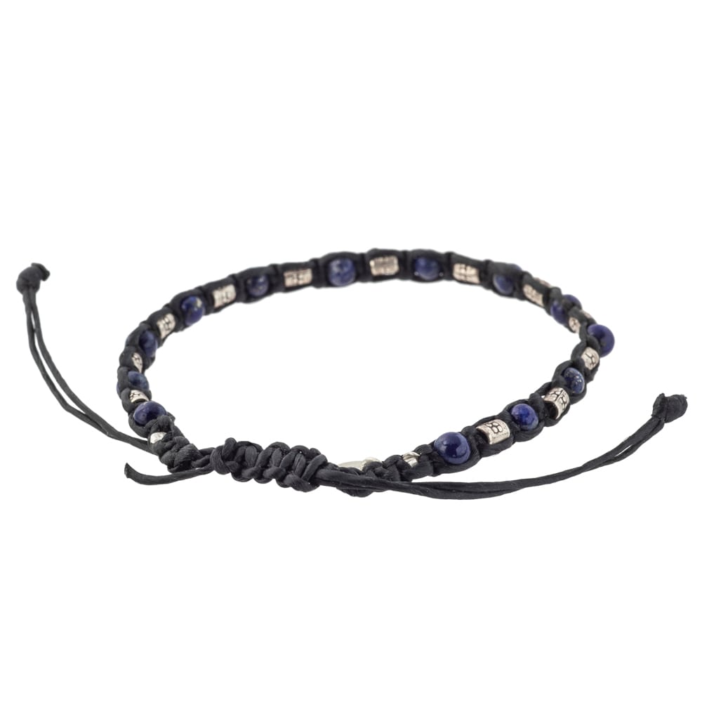 ワックスコードで天然ラピスラズリとシルバービーズを編みこんだシンプルブレス。服装も合わせやすい、ユニセックス細めのシングル巻きブレス。藍色石のブレスは、腕元を凛とし洗練された雰囲気にします。アジャスターが付いているので長さの調節も可能。アルテミスクラシックの刻印入りシルバーチップがあしらわれます。