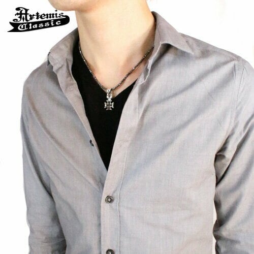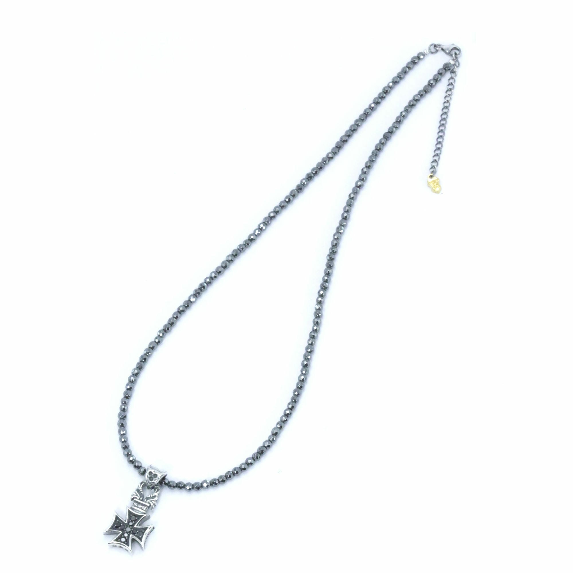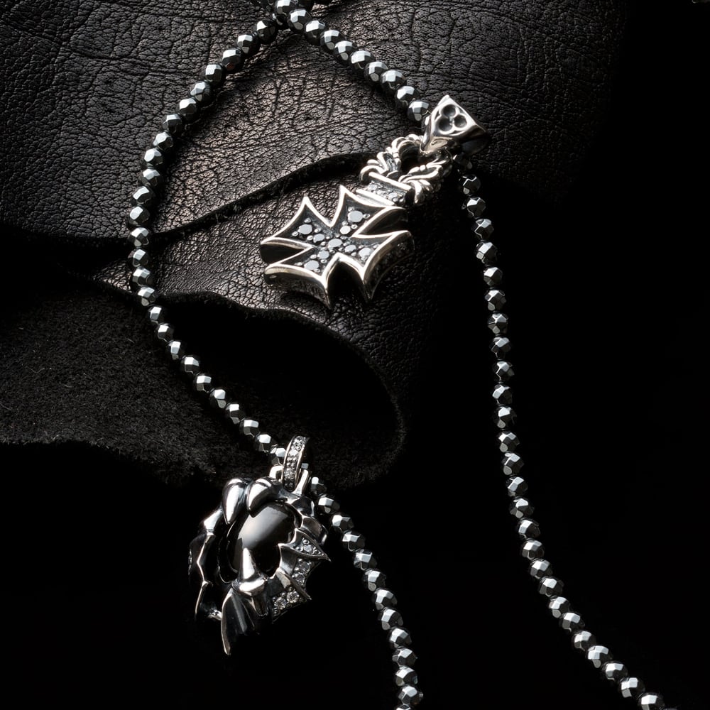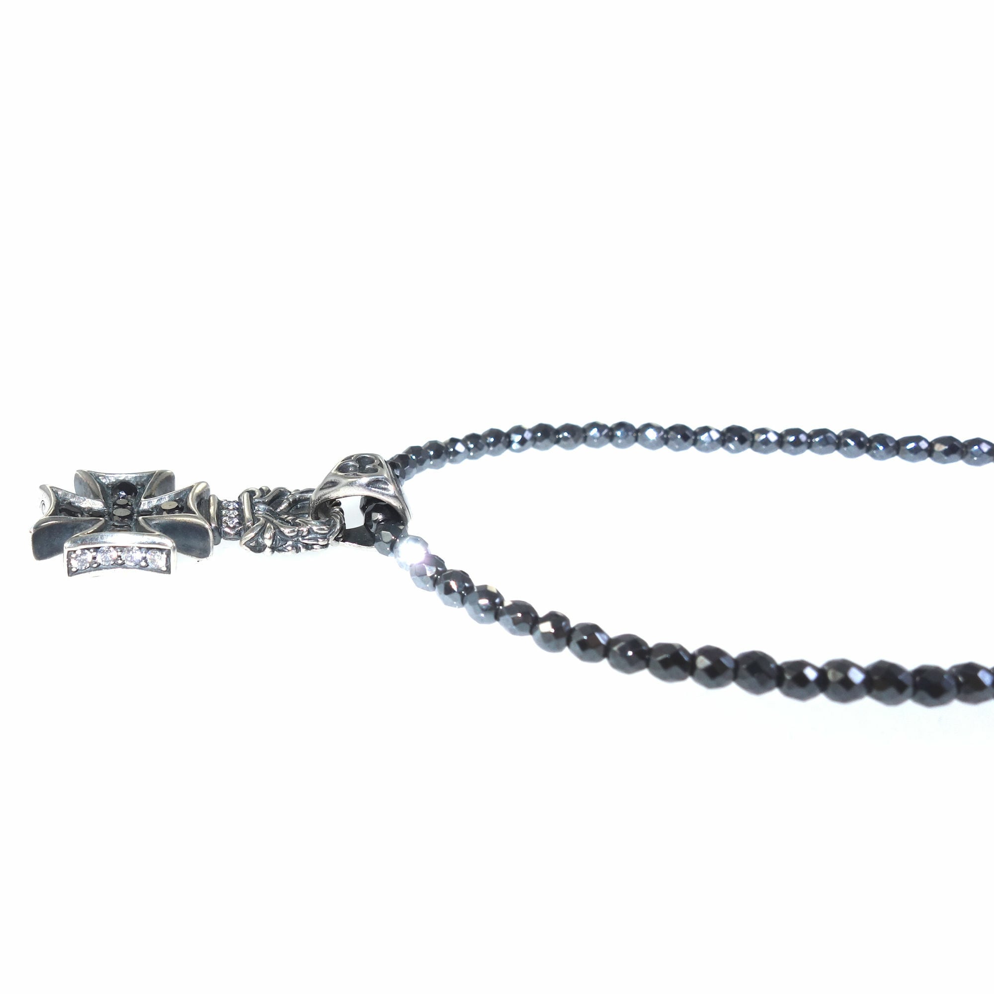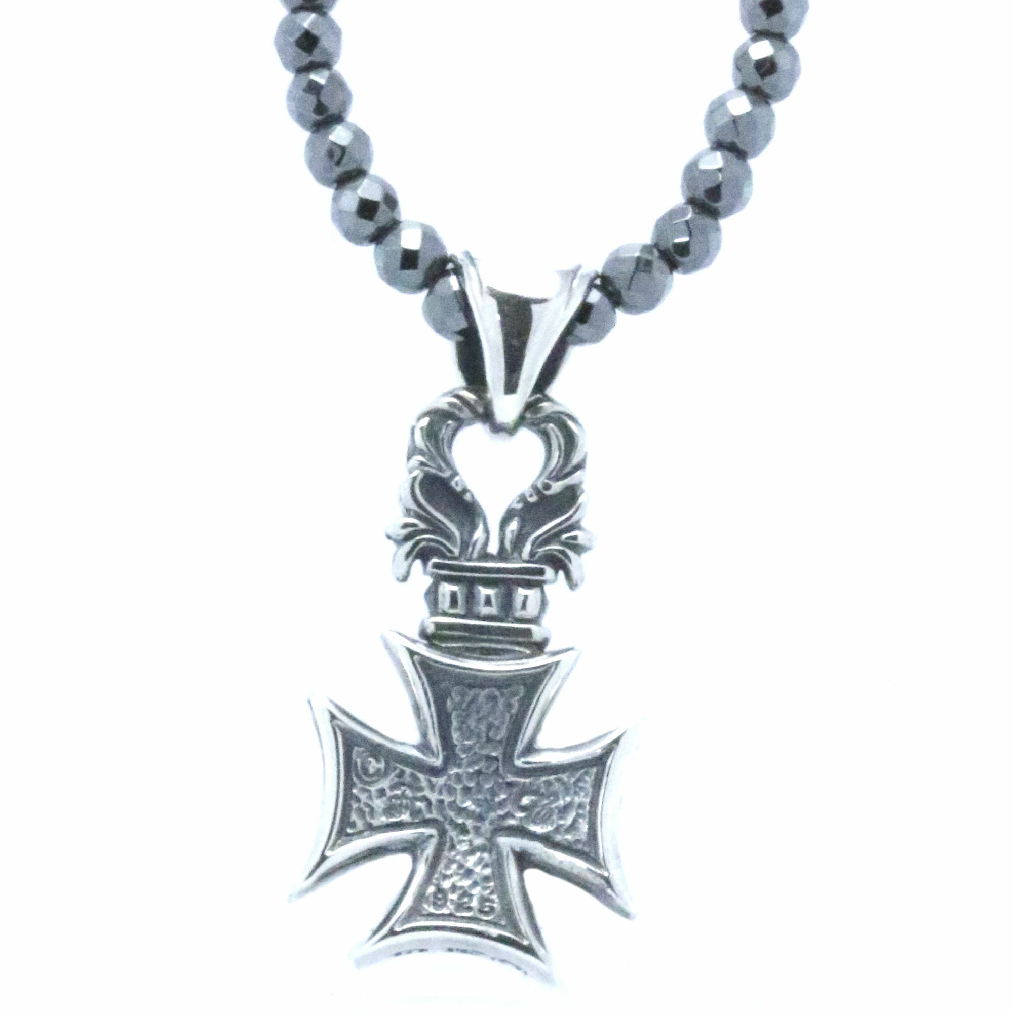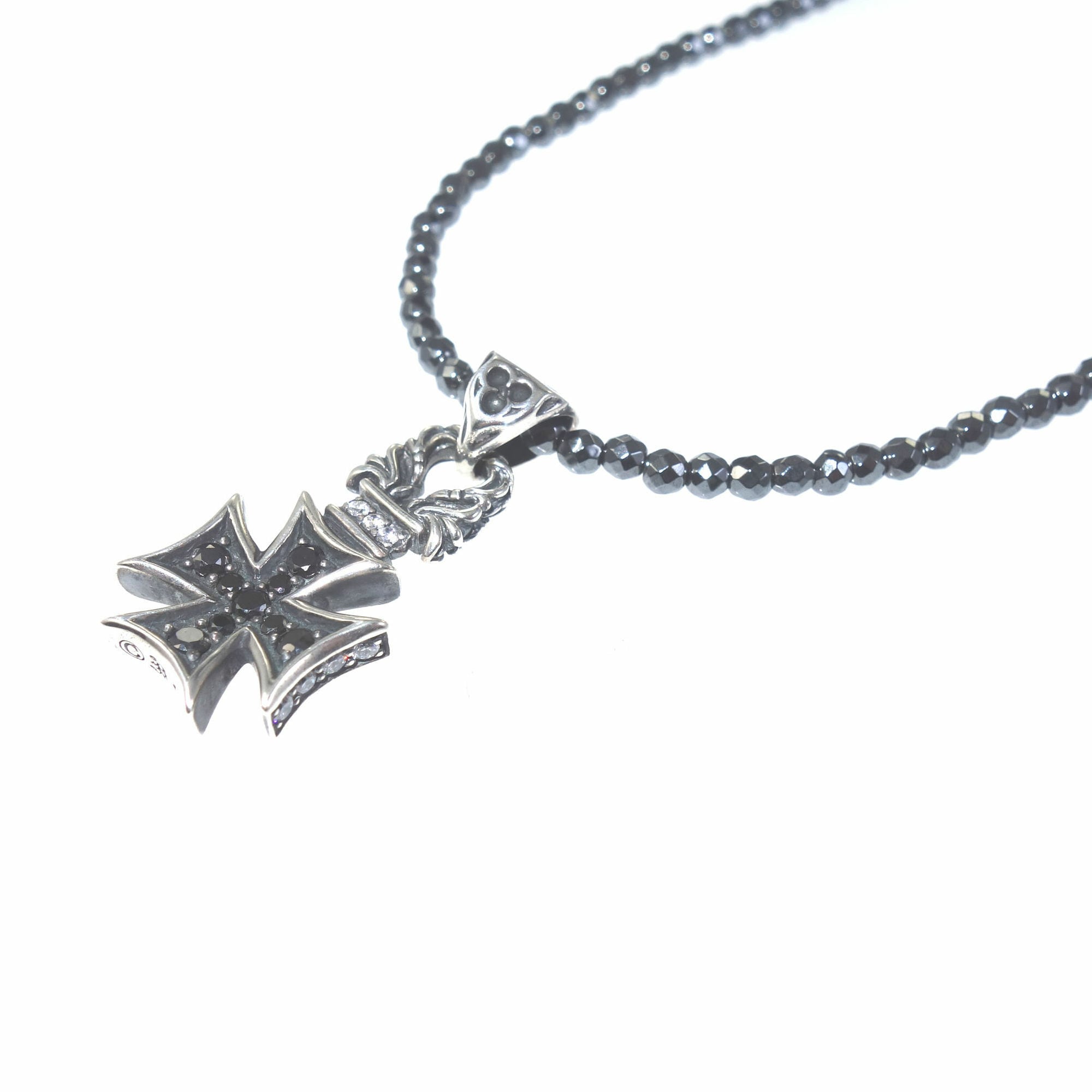 アイアンクロスをジルコニアと植物装飾でゴージャスに飾ったペンダント。いぶされた銀の質感と輝石の美しい調和が魅力!クロス全体にパヴェセッティングを施し、ジュエリーライクな仕上がり。チェーンは光の反射が美しいヘマタイト。とても高級感ある造りで、美しい煌きを放ちます。