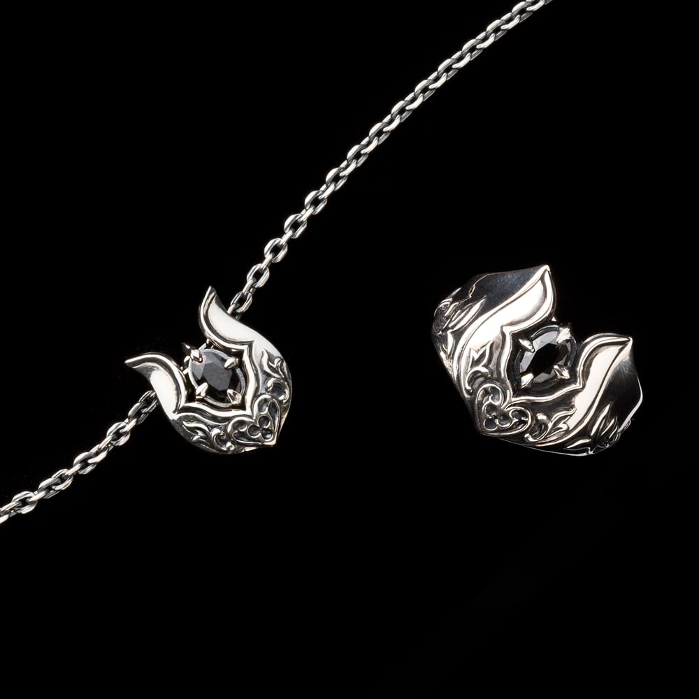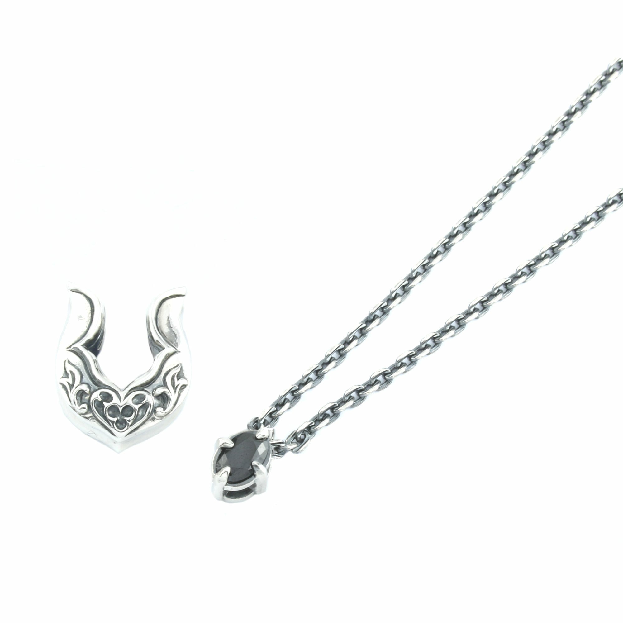 幸運を呼ぶ蹄鉄〈ホースシュー〉を、端正にモダンへ。中央には一粒ストーンのペンダント、その外側をホースシューが包む二重構造。小さなチェーンで結合され、前後のレイヤーがわずかに揺れて胸元に奥行きを生み出します。ホースシューを外せば、ミニマルな一粒だけで上品に。重ねれば、象徴性と存在感が際立つ――気分で使い分けできる2WAY仕様です。表情はアルテミスクラシックらしい唐草とトレサリーの意匠。磨きといぶしのコントラストが陰影を描き、黒石の艶を凛と引き立てます。フォルムはすっきりと小ぶりながら、近くで見るほど作りの丁寧さが伝わる仕立て。アトリエで一つずつ成形・彫り・磨きを重ね、肌あたりまで滑らかに整えました。毎日に幸運と気品を添える小さな“お守り”ペンダントです。
