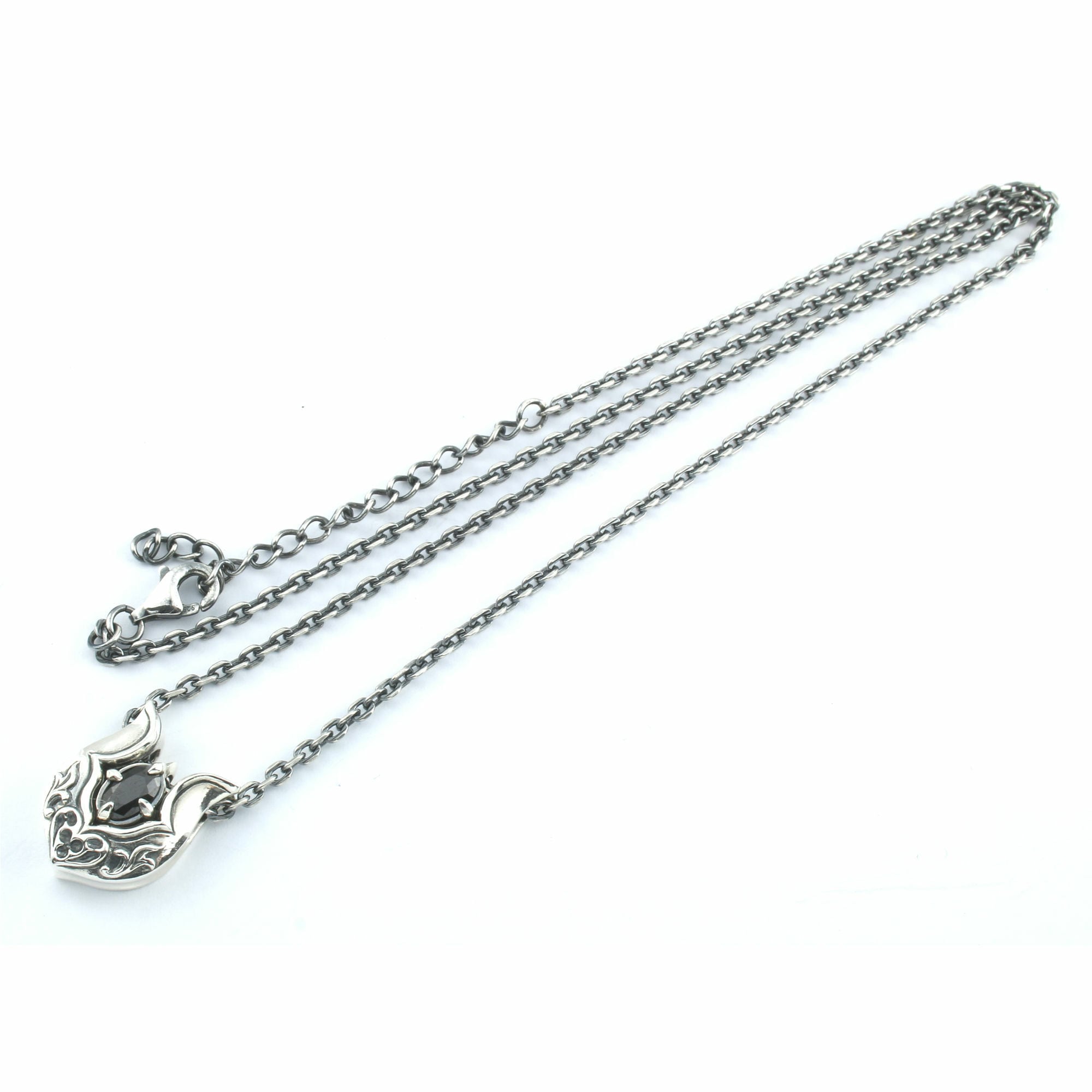 At the center sits a single black stone; around it, a sculpted horseshoe—long a symbol of good fortune—forms a sleek outer frame. The two parts are linked by a small connector chain, creating a subtle layered motion that gives the neckline depth. Wear it two ways: remove the horseshoe for a minimal solitaire look, or layer them together for stronger symbolism and presence. Signature Artemis Classic scrolls and tracery add character, while the interplay of polished silver and soft oxidization sharpens the stone’s glossy sheen. Compact in size yet rich in detail, each piece is individually formed, engraved, and hand-finished in our atelier for a smooth touch against the skin. A modern talisman to bring poise—and a little luck—to every day.