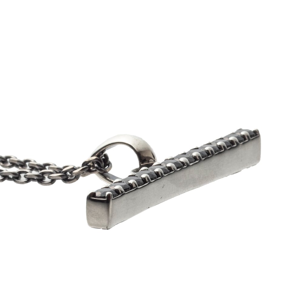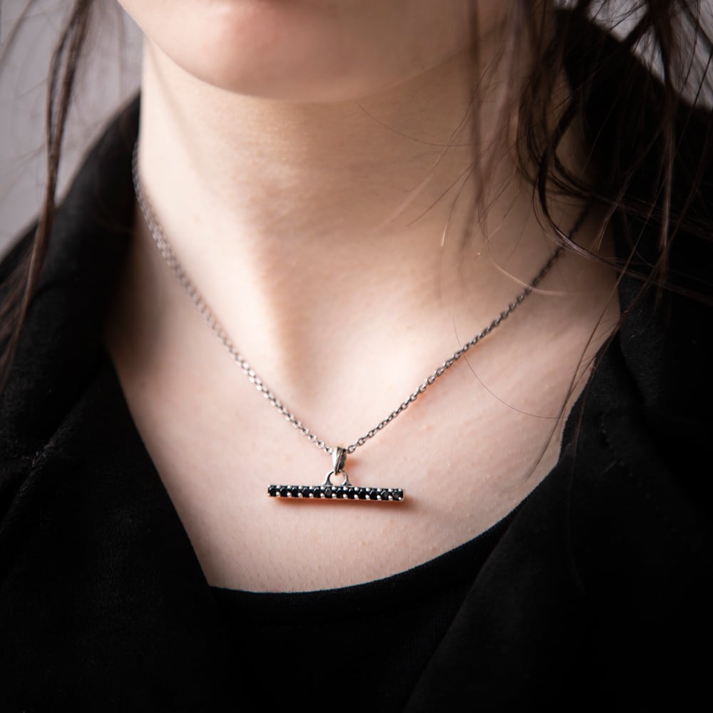 Straight pavé bar pendant. Simple and elegant construction gives a cool impression. Each time the glitter of light sways, the expression changes to color the chest. The size is also moderately sized and has a sophisticated and elegant atmosphere. The simple form is easy to use even daily, and it goes well with both formal and casual wear.