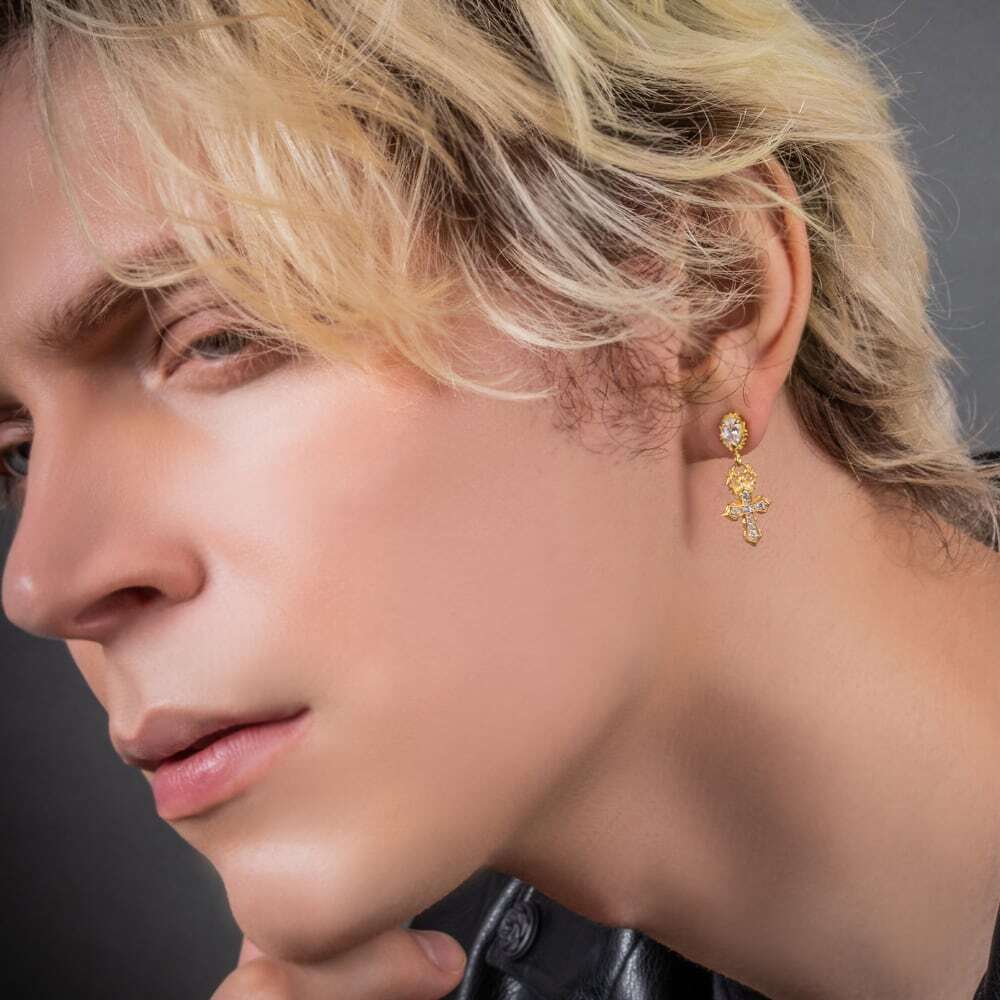 耳元に、黄金の聖光が滴る。スタッドにはオーバルカットのクリアCZをセットし、繊細な唐草の爪飾りで包み込むようにホールド。下へと連なるクロスには、センターに誕生石とパヴェのCZをびっしりと敷き詰め、微細な光をほどきます。裏側にはレイヤードクロスの意匠を忍ばせ、見えない面まで端正に。全体に10金イエローゴールドメッキを贅沢に施し、肌映りの良いリュクスな艶を実現しました。小ぶりでバランスの取れたプロポーションは、さりげないスウィングとともに顔周りを上品に引き立て、デイリーからドレスアップまで自在に対応。キャッチにはブランドロゴと〈925〉の品質刻印。石留めから最終ポリッシュまで、工房の手仕事で仕上げた、大人のための小さなアートピースです。