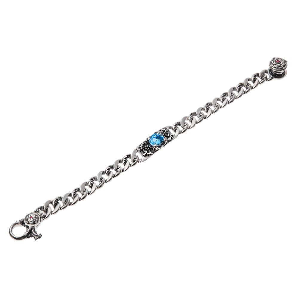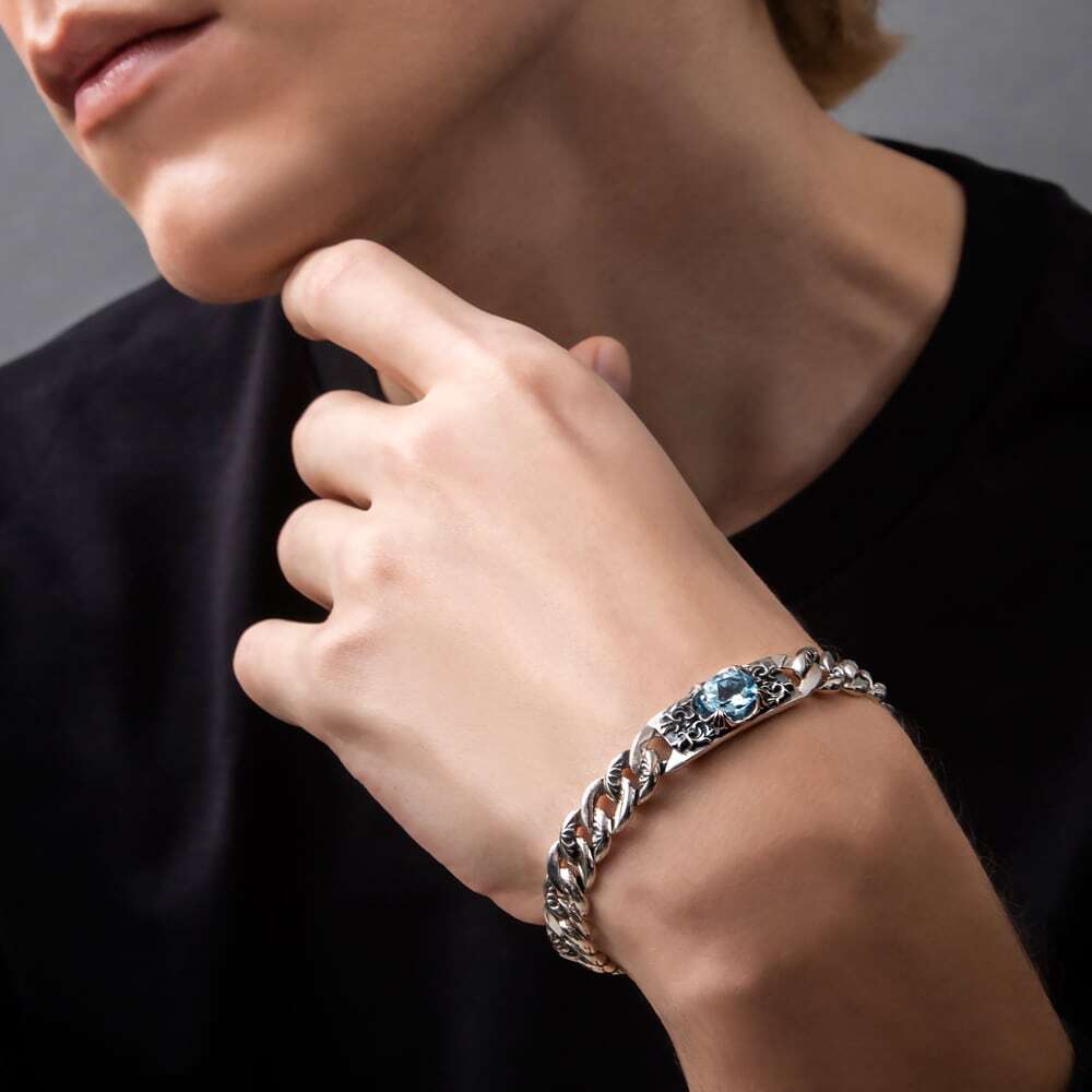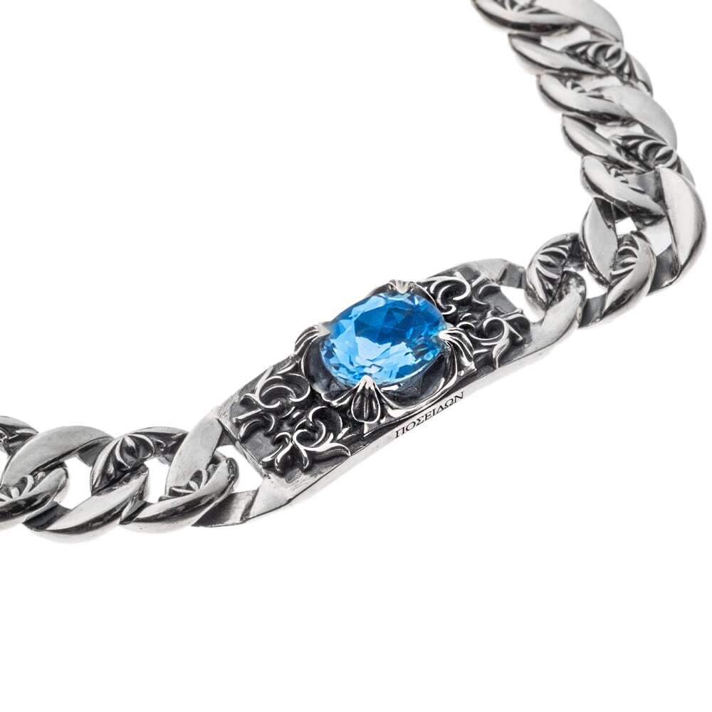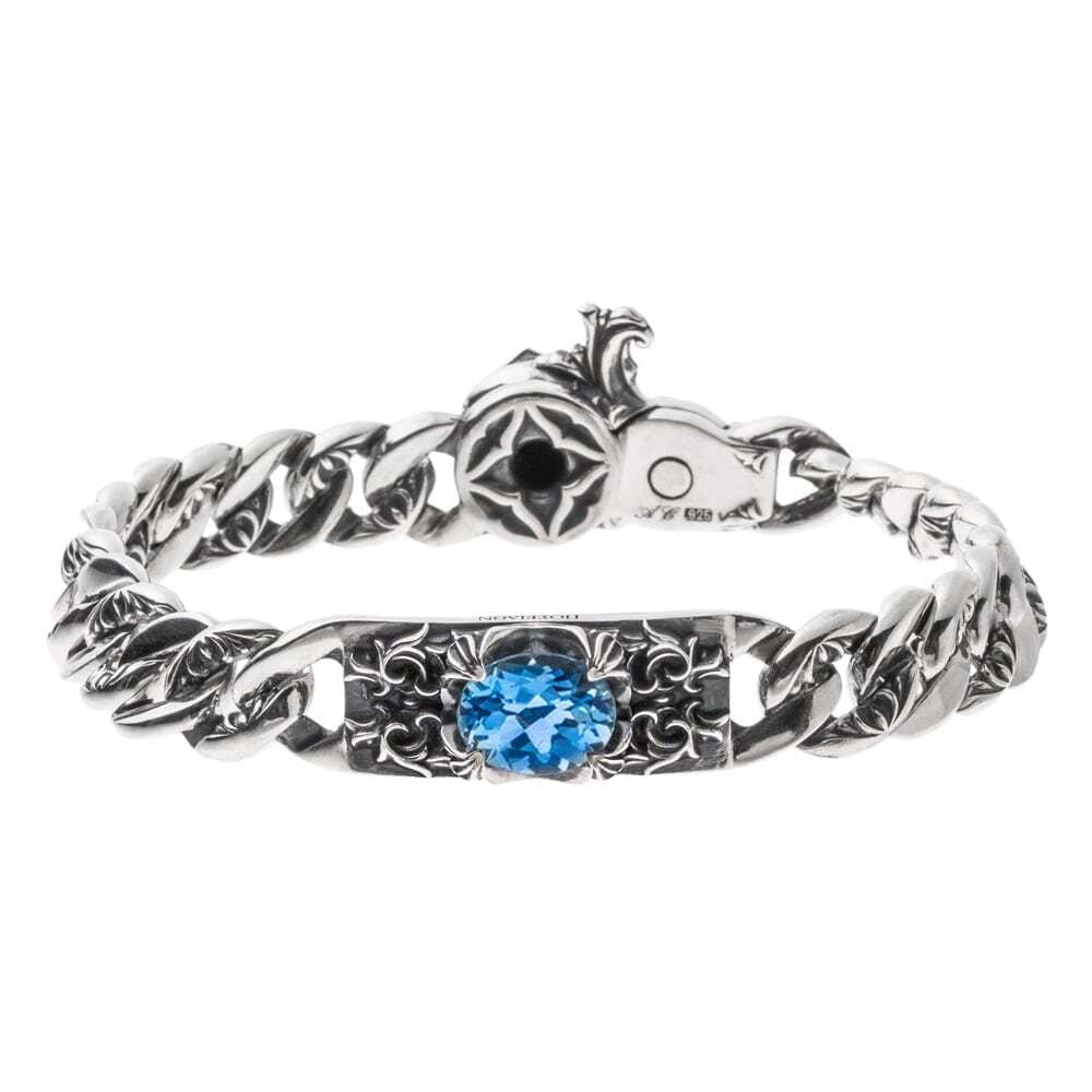 モチーフは、ポセイドンの神話世界を現代に訳した一本。燻しを効かせたSV925の喜平チェーンに、アラベスクを刻んだリンクを交互に配し、鏡面の艶と陰影が重なり合うことで、手首の上に奥行きある表情を描きます。センターのIDプレートには澄み渡るブルートパーズをセット。リーフ状の爪が石を抱き、側面にはギリシャ語“ΠΟΣΕΙΔΩΝ(ポセイドン)”の刻印、背面のトレサリー型の透かし窓が光を取り込み、海のような青をいっそう鮮烈に際立たせます。