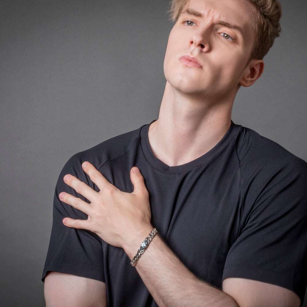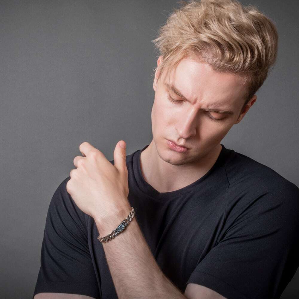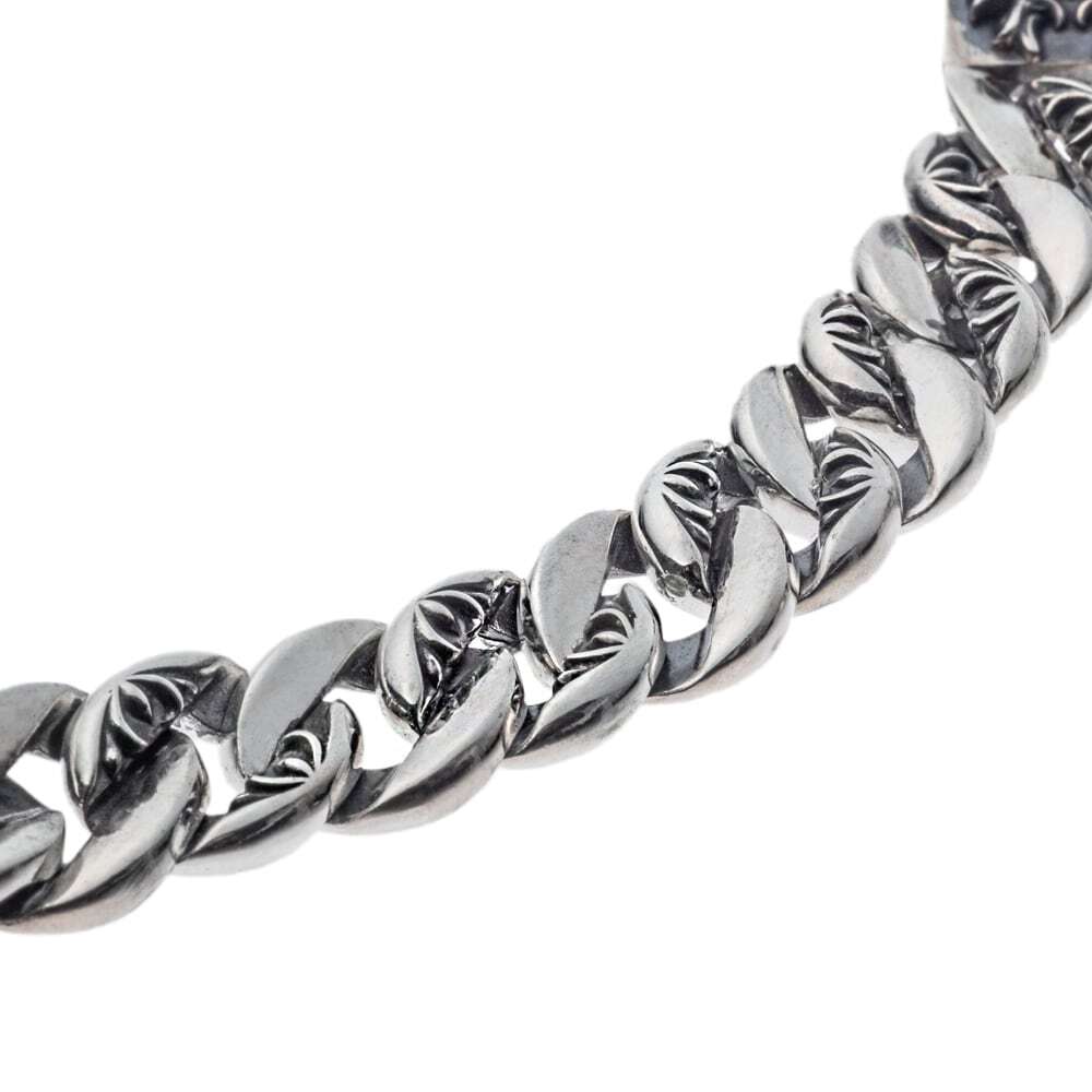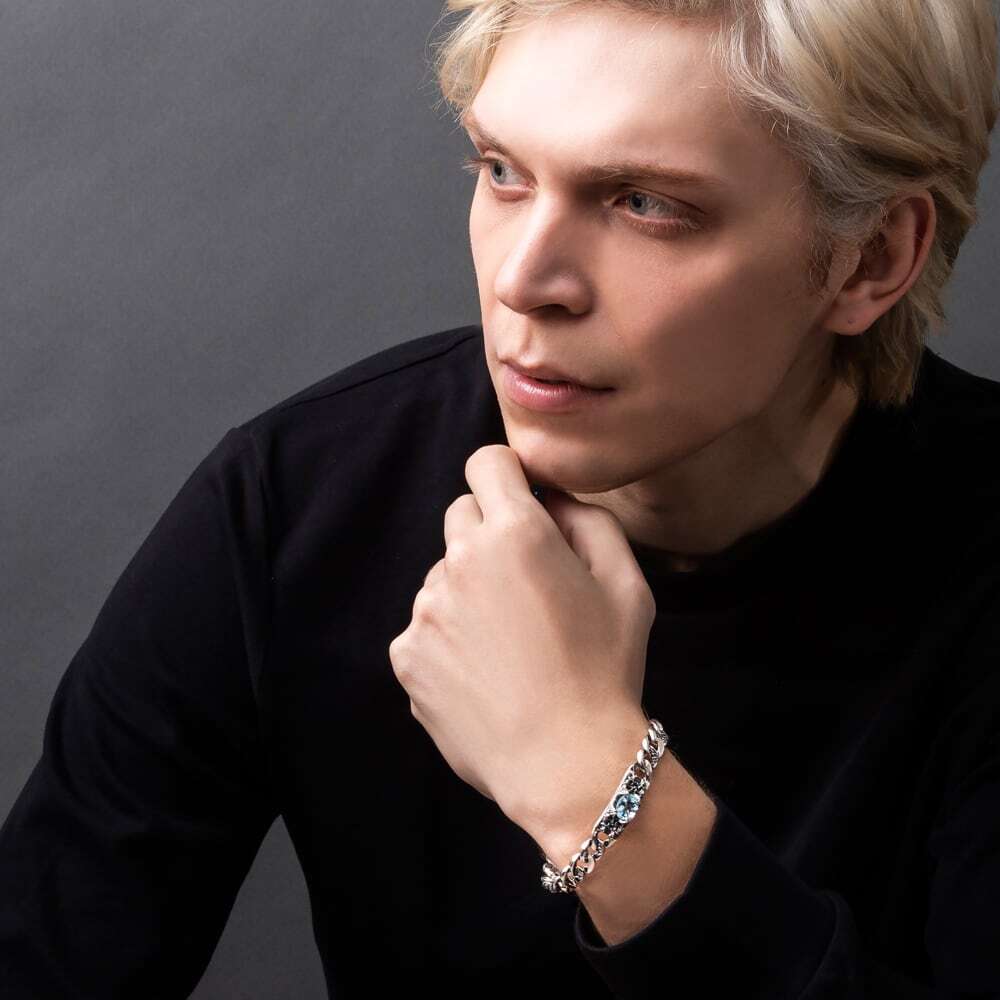 モチーフは、ポセイドンの神話世界を現代に訳した一本。燻しを効かせたSV925の喜平チェーンに、アラベスクを刻んだリンクを交互に配し、鏡面の艶と陰影が重なり合うことで、手首の上に奥行きある表情を描きます。センターのIDプレートには澄み渡るブルートパーズをセット。リーフ状の爪が石を抱き、側面にはギリシャ語“ΠΟΣΕΙΔΩΝ(ポセイドン)”の刻印、背面のトレサリー型の透かし窓が光を取り込み、海のような青をいっそう鮮烈に際立たせます。