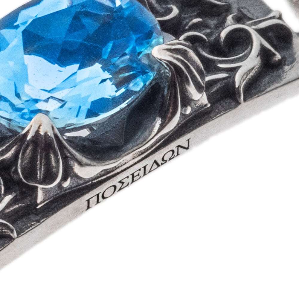 The design translates the mythic world of Poseidon into a contemporary piece of jewelry. An oxidized sterling silver (SV925) curb chain is interspersed with links engraved with arabesque motifs; the interplay of mirror-like polish and darkened relief creates a deep, dimensional expression on the wrist. At the center, the ID plate is set with a clear blue topaz. Leaf-shaped prongs cradle the stone, while the side of the plate is engraved with the Greek word “ΠΟΣΕΙΔΩΝ (Poseidon).” On the back, a tracery-style openwork window lets in the light, making the sea-colored sparkle even more vivid.