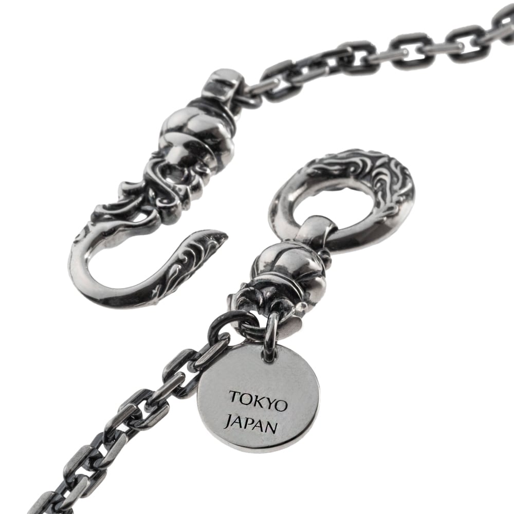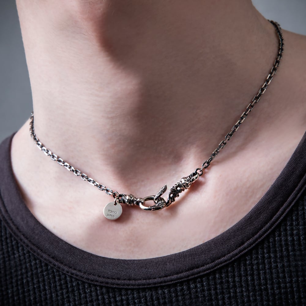 フロントで“見せる”留め金具を美麗にデザインした、フック×オーバルリングのシルバーチェーンネックレス。アンティーク調の金具と、燻し仕上げのSV925に4面カットアズキを組み合わせ、奥行きある陰影と繊細なきらめきを宿しました。ほどよい重量が首元にしっとり馴染み、片手での着脱もスムーズ。丸プレートには片面に「Artemis Classic」、もう片面に「TOKYO JAPAN」の刻印を配し、静かな品格を添えています。単体で主役としても、他のチェーンやペンダントとのレイヤードでも美しく調和。ユニセックスで、M=43cm/L=47cmの2サイズ展開。提携アトリエの確かなクラフトマンシップで、ハンドメイド制作。細部のクオリティで語る、小さなアートピースです。
