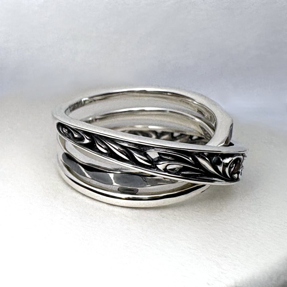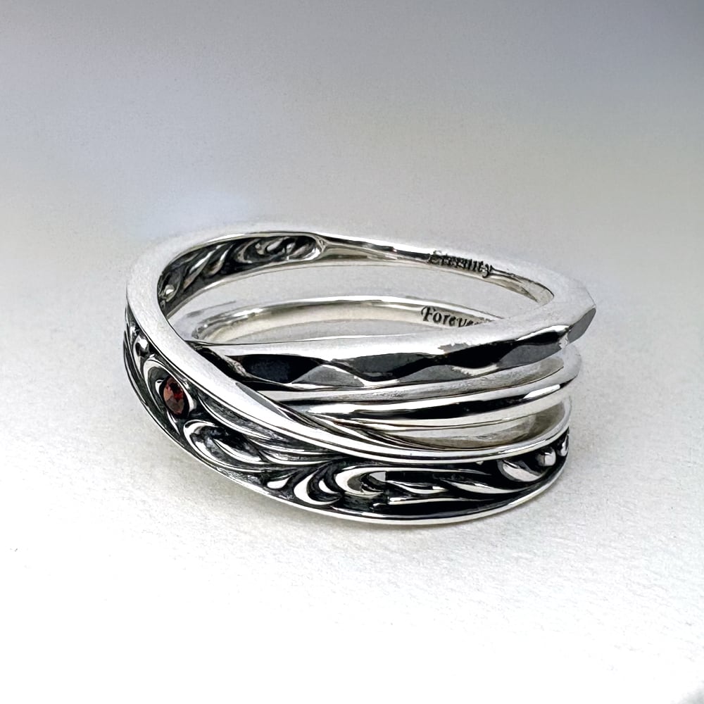 This is an official web-exclusive custom model where you can choose your 1.8mm birthstone. Limited to 500 pieces, each with a unique serial number, each embodying individual character. Three beauties in one ring, themed around eternity. Plain, hammered, and openwork arabesque—the triple-wrap band with different textures intersects three-dimensionally, creating a design that changes its appearance from every angle. The contrast between the mirror-like shine, the shadows of the hammered surface, and the openwork arabesque creates an elegant depth on the hand. The inside is smoothly rounded for an incredibly comfortable fit. Based on the brand's supervision, the partner workshop handled the forging, shaping, and polishing of this piece, and the inside is engraved with "ETERNITY" and "FOREVER." Its understated yet balanced volume elegantly matches everything from everyday wear to special occasions, and it's unisex, making it perfect for couples. A modern classic that symbolizes eternal love and happiness, a piece you can cherish for years to come. A perfect gift.