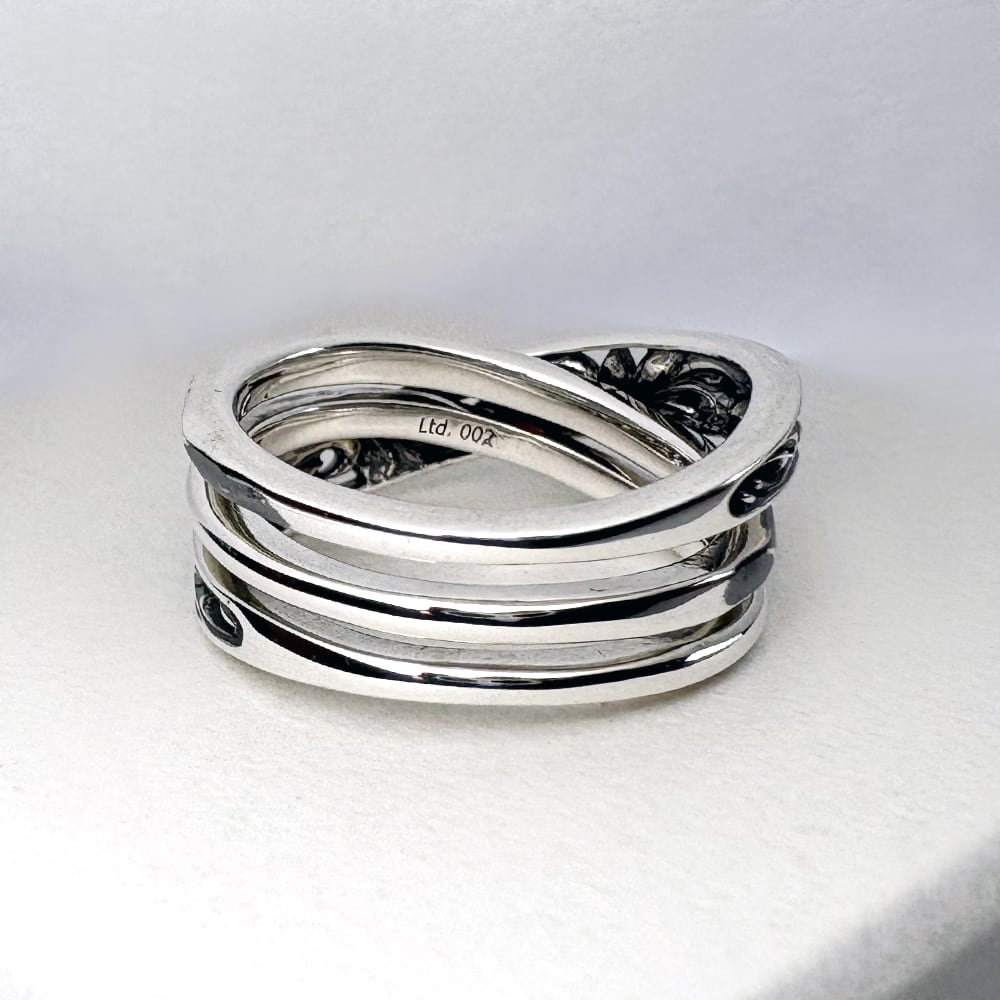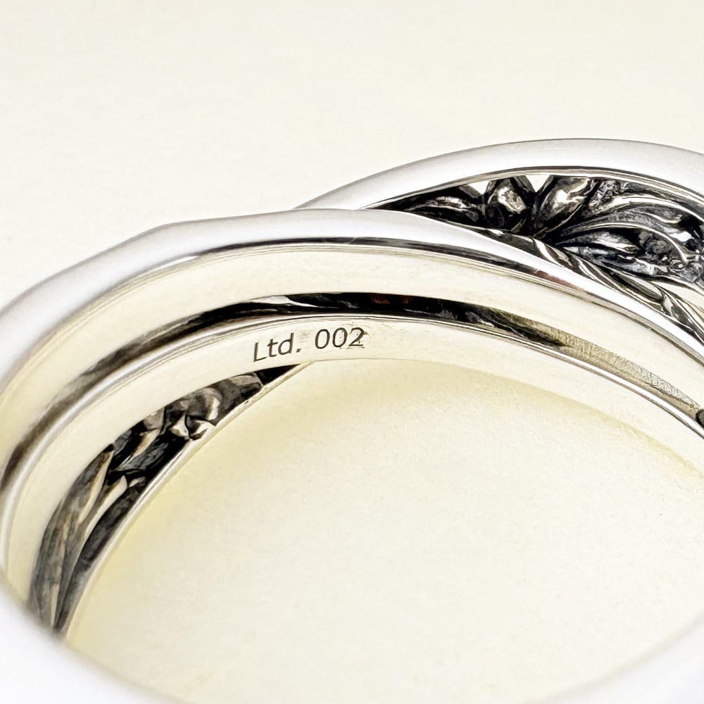 1.8mm誕生石を選べる公式WEB限定カスタムモデル。各番号に個体差の誇りを宿す、500本限定・シリアルナンバー入り。永遠をテーマに、三つの美を一本に。プレーン、槌目、透かし唐草――質感の異なる三重巻のバンドが立体的に交差し、角度ごとに表情を変えるデザインリングです。鏡面の艶と槌目の陰影、唐草の透かしが織りなすコントラストは、手元に気品ある奥行きを演出。内側は滑らかにラウンドさせ、驚くほど心地よい装着感に仕立てました。ブランドの監修をもとに、提携工房が鍛造・成形・研磨を一貫して担った作品、内側には「ETERNITY」「FOREVER」の刻印を配置。派手すぎず程よいボリュームが日常から特別な装いまで上品にマッチし、ユニセックスでペア使いにも最適です。永遠の愛と幸せを象徴する、長く愛せるモダン・クラシック。ギフトにもふさわしい一品です。