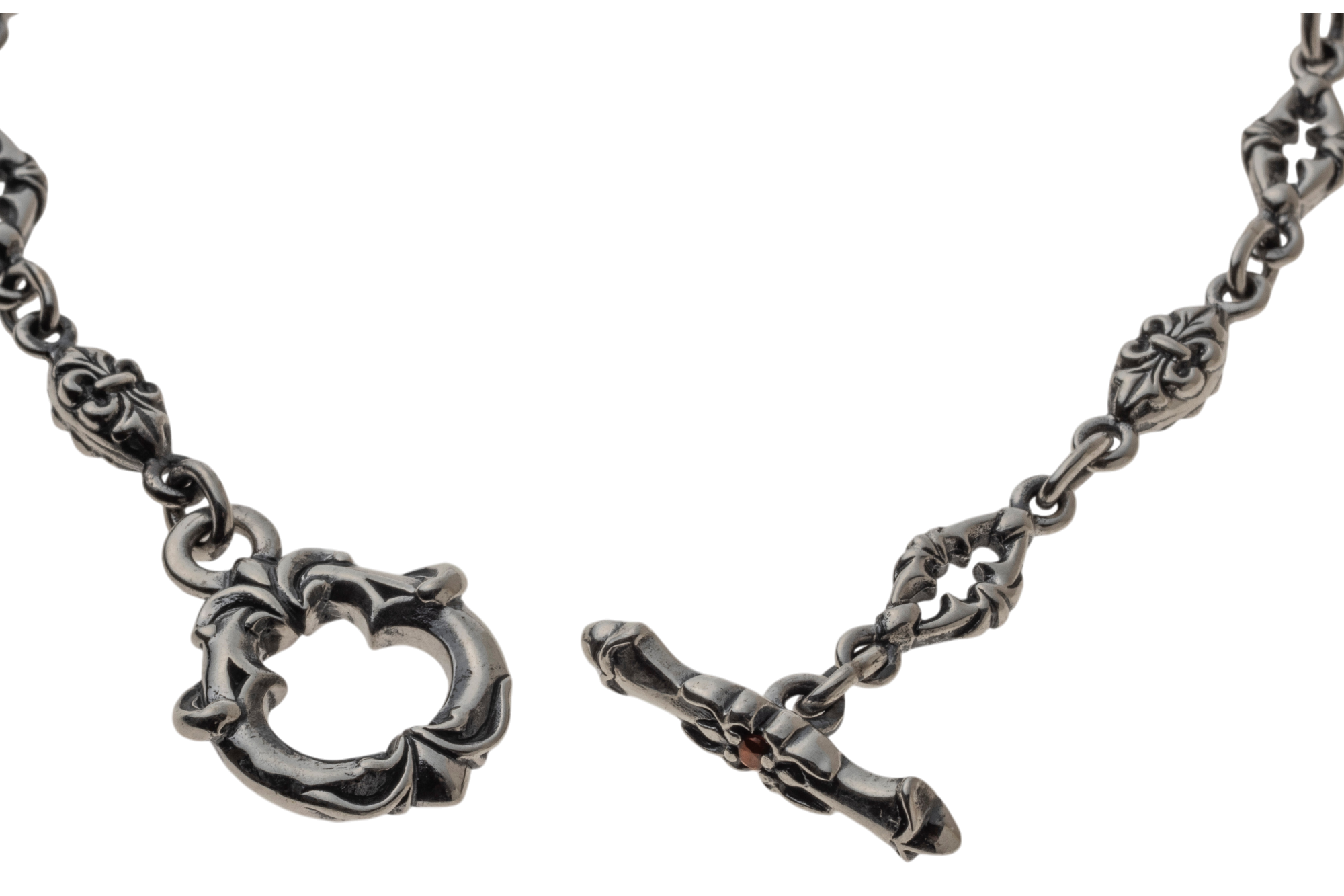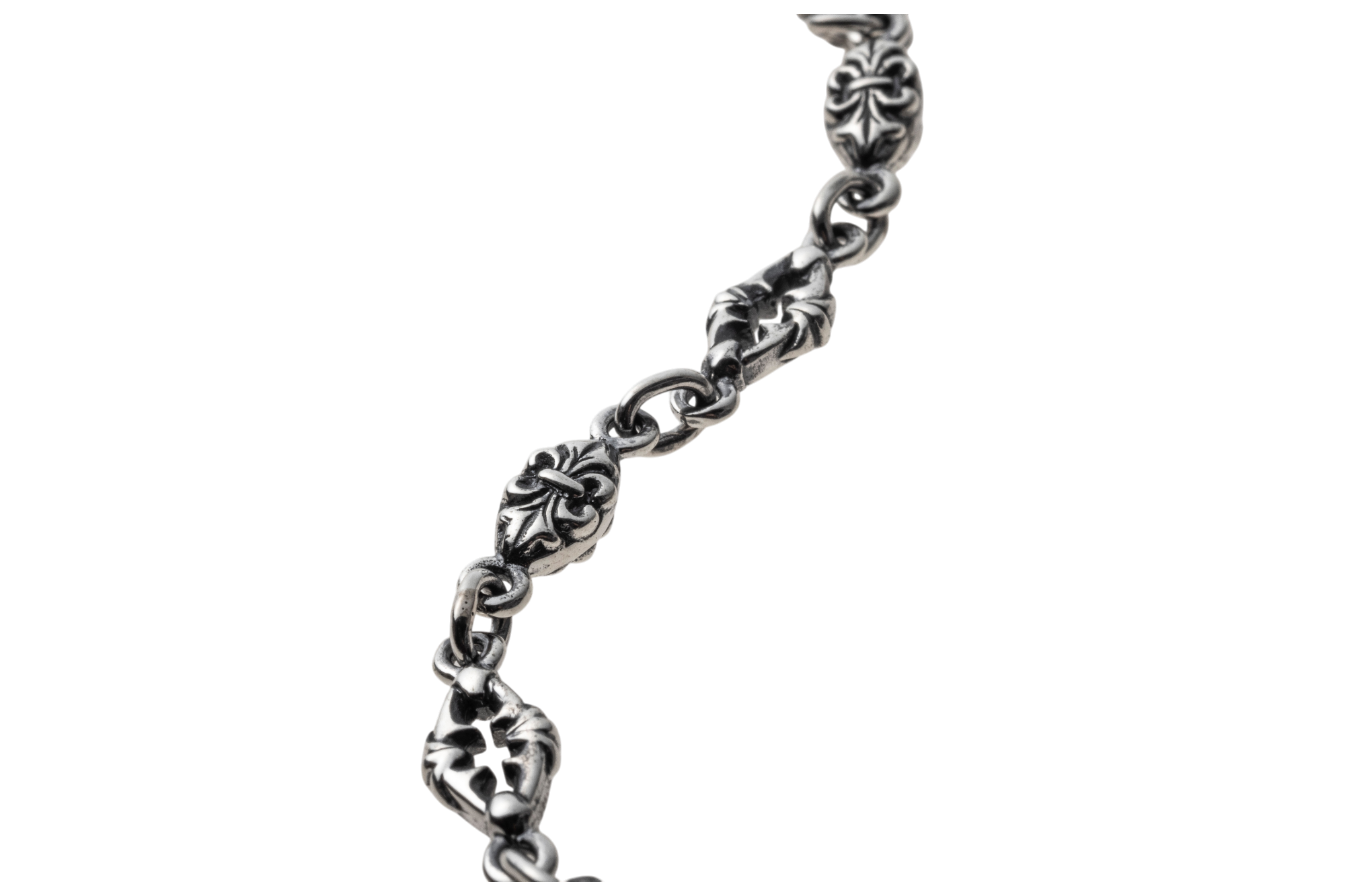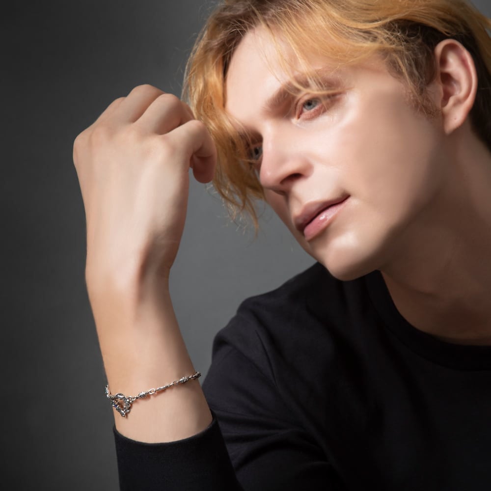 フルール・ド・リスとトレサリーを交互に連ねた、SV925のチェーンブレスレット。微細なエングレービングに燻しを施し、リンク一つひとつに奥行きと気品を宿しました。留め具はTバー式。リング&バーにもフルール・ド・リスをあしらい、着脱の所作までエレガントに演出します。細身ながらも銀の艶が手首でさりげなく煌めき、シャツの袖口にもすっきり収まるバランス。単体でミニマルに、時計や他のブレスレットと重ねても美しく調和します。日常からドレスアップまで幅広く活躍する、ACらしい精巧なつくりのユニセックスピース。控えめな存在感で装いを一段格上げする、長く愛せる定番です。
