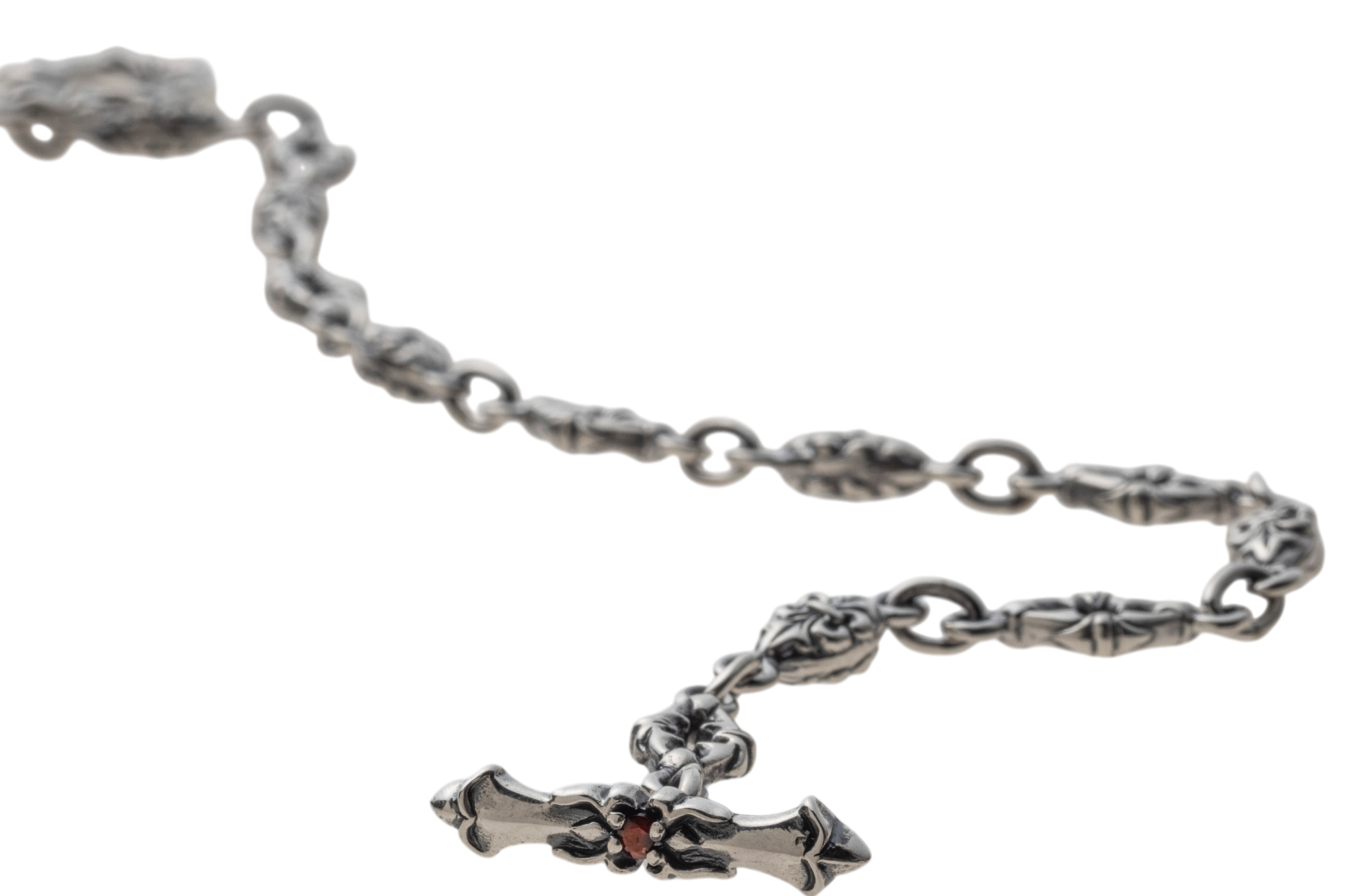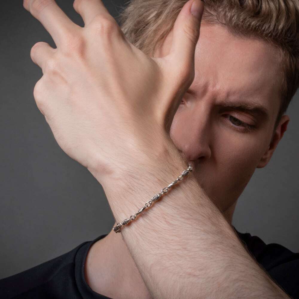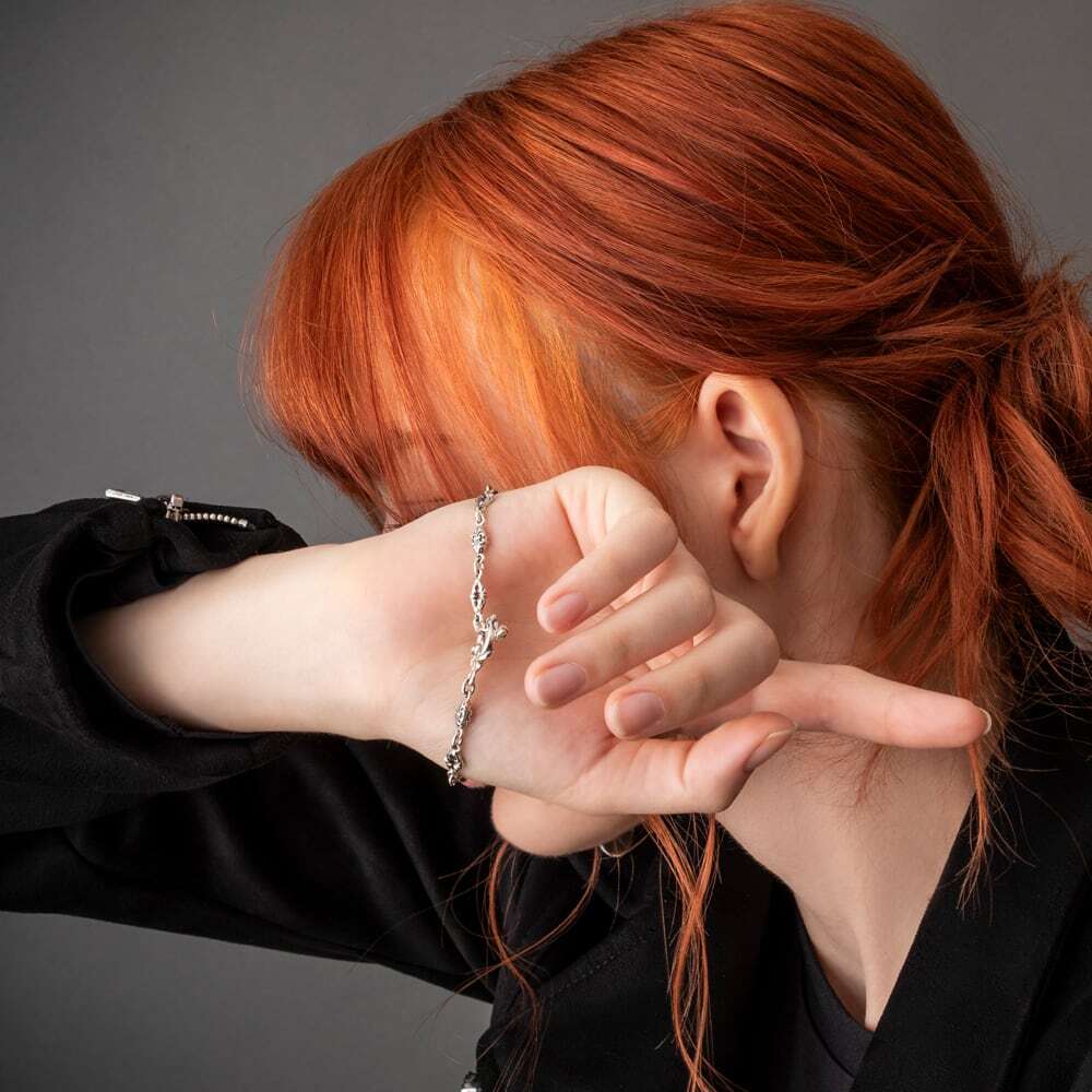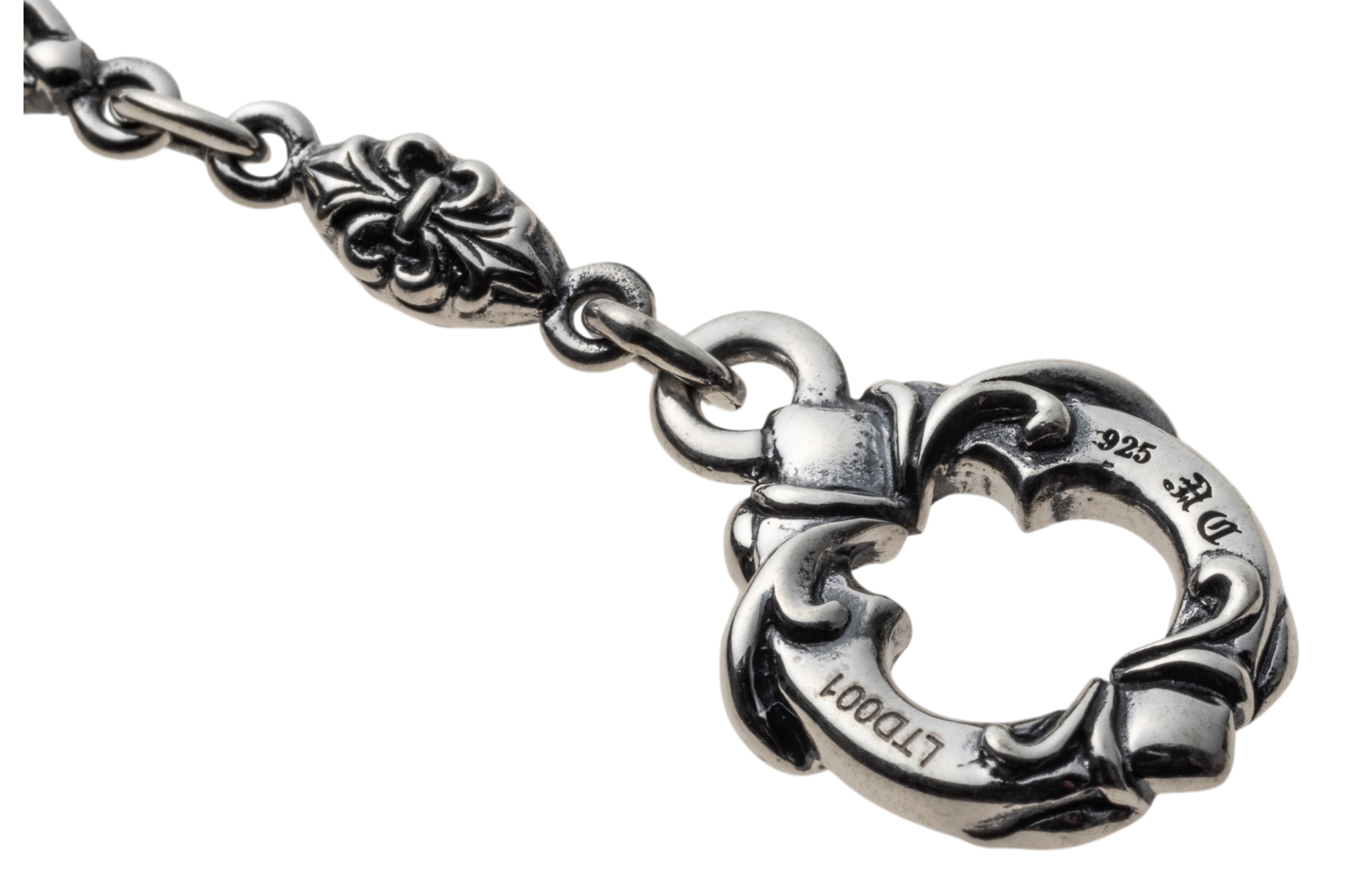 フルール・ド・リスとトレサリーを交互に連ねた、SV925のチェーンブレスレット。微細なエングレービングに燻しを施し、リンク一つひとつに奥行きと気品を宿しました。留め具はTバー式。リング&バーにもフルール・ド・リスをあしらい、着脱の所作までエレガントに演出します。細身ながらも銀の艶が手首でさりげなく煌めき、シャツの袖口にもすっきり収まるバランス。単体でミニマルに、時計や他のブレスレットと重ねても美しく調和します。日常からドレスアップまで幅広く活躍する、ACらしい精巧なつくりのユニセックスピース。控えめな存在感で装いを一段格上げする、長く愛せる定番です。
