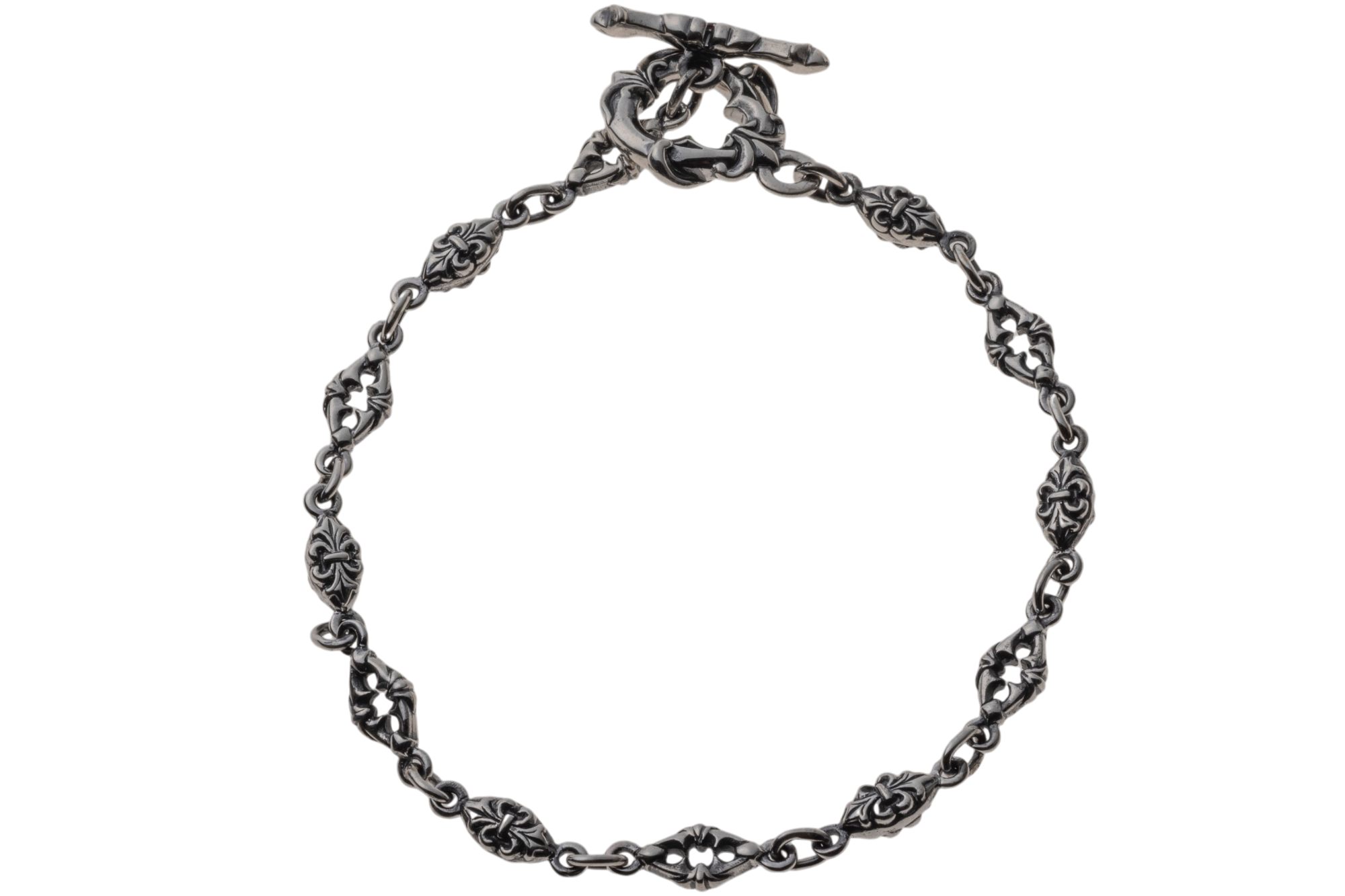 This SV925 chain bracelet alternates fleur-de-lis motifs with intricate trellis patterns. Each link is finely engraved and finished with oxidized detailing, creating depth and refined elegance throughout. The clasp features a T-bar design, with both the ring and bar adorned with fleur-de-lis accents—bringing sophistication even to the act of fastening.