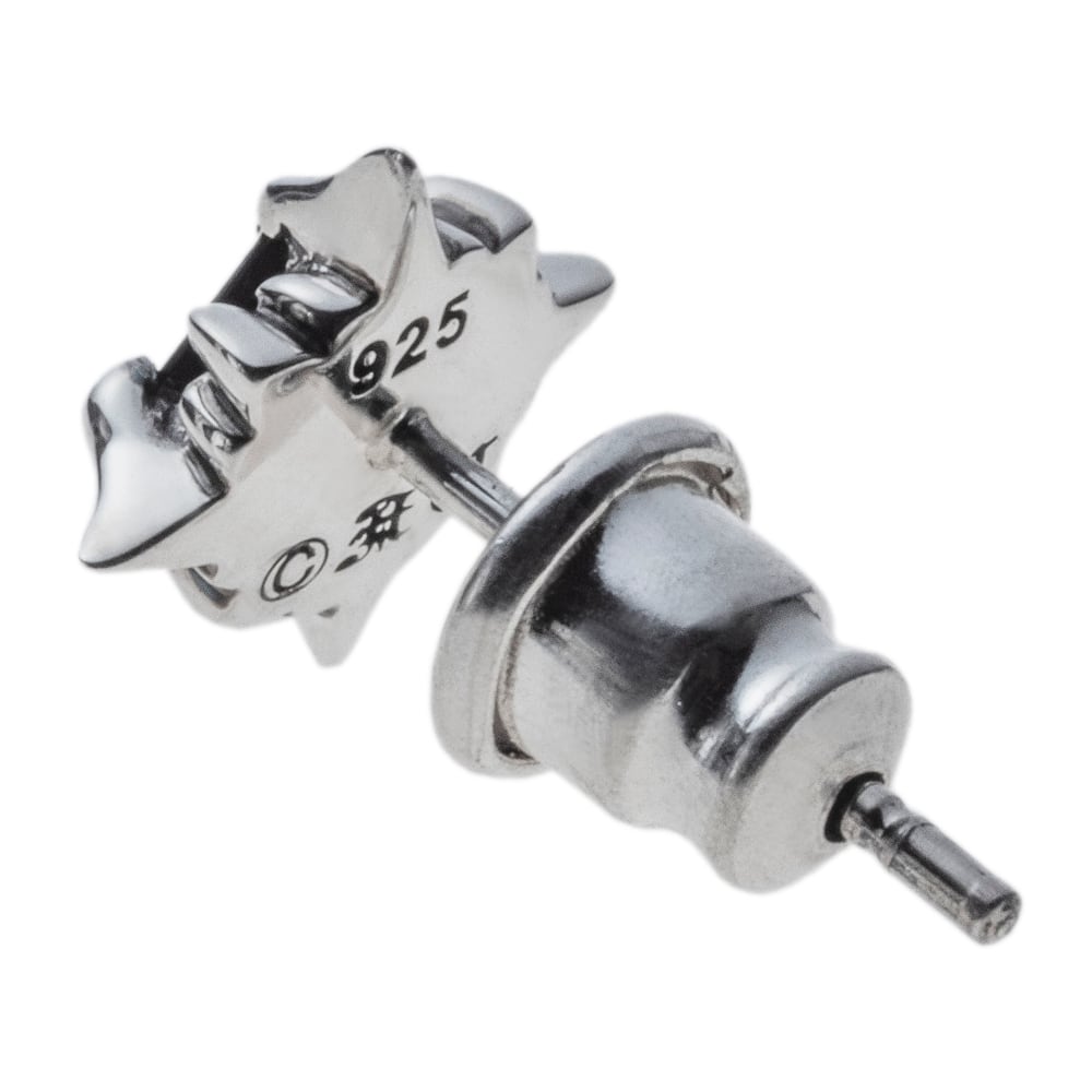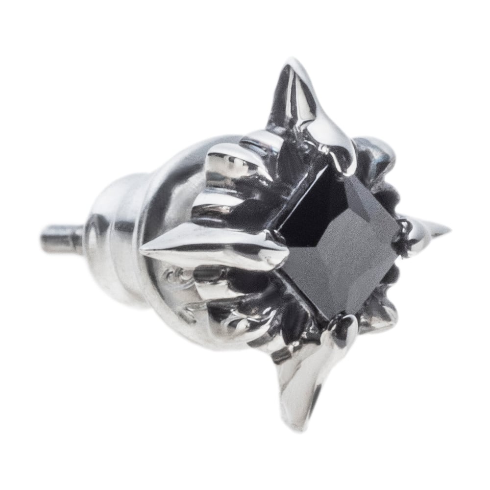 A single drop of condensed light for the ear. A cross fused with fleur-de-lis arms reaches out in four directions, lifting a princess-cut black cubic zirconia with razor-clean poise. The inky stone seems to drink in the light, leaving a cool, understated gleam that sharpens the line of the lobe. Mirror-polished silver and fine groove engraving create rich chiaroscuro—composed head-on, strikingly sculptural at an angle. Prong angles and setting height are precisely engineered, while the clutch glides on smoothly and holds with quiet confidence. Crafted under the brand’s direction at a partner atelier with true savoir-faire. Subtle yet certain, it elevates any look—a small art piece you’ll reach for again and again.