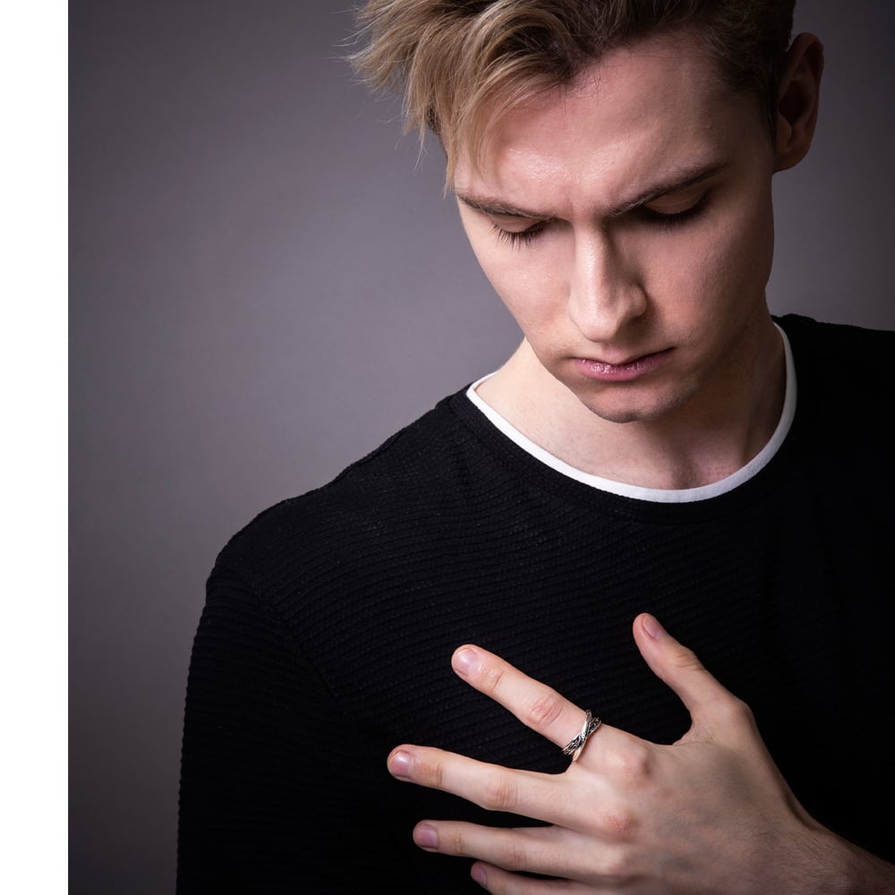 Two fluid lines cross and wrap to trace an elegant infinity: a double-wrap ring that balances contrast and harmony. One band is mirror-polished to a liquid glow; the other bears oxidized arabesque engraving, layering light and shadow for refined dimension. A single star-set clear stone crowns the apex—subtle, precise, and quietly luminous. The inner surface is smoothly contoured for comfort, while the poised volume flatters the finger. Worn solo it makes a crisp statement; stacked with slim bands it composes a beautifully balanced silhouette.