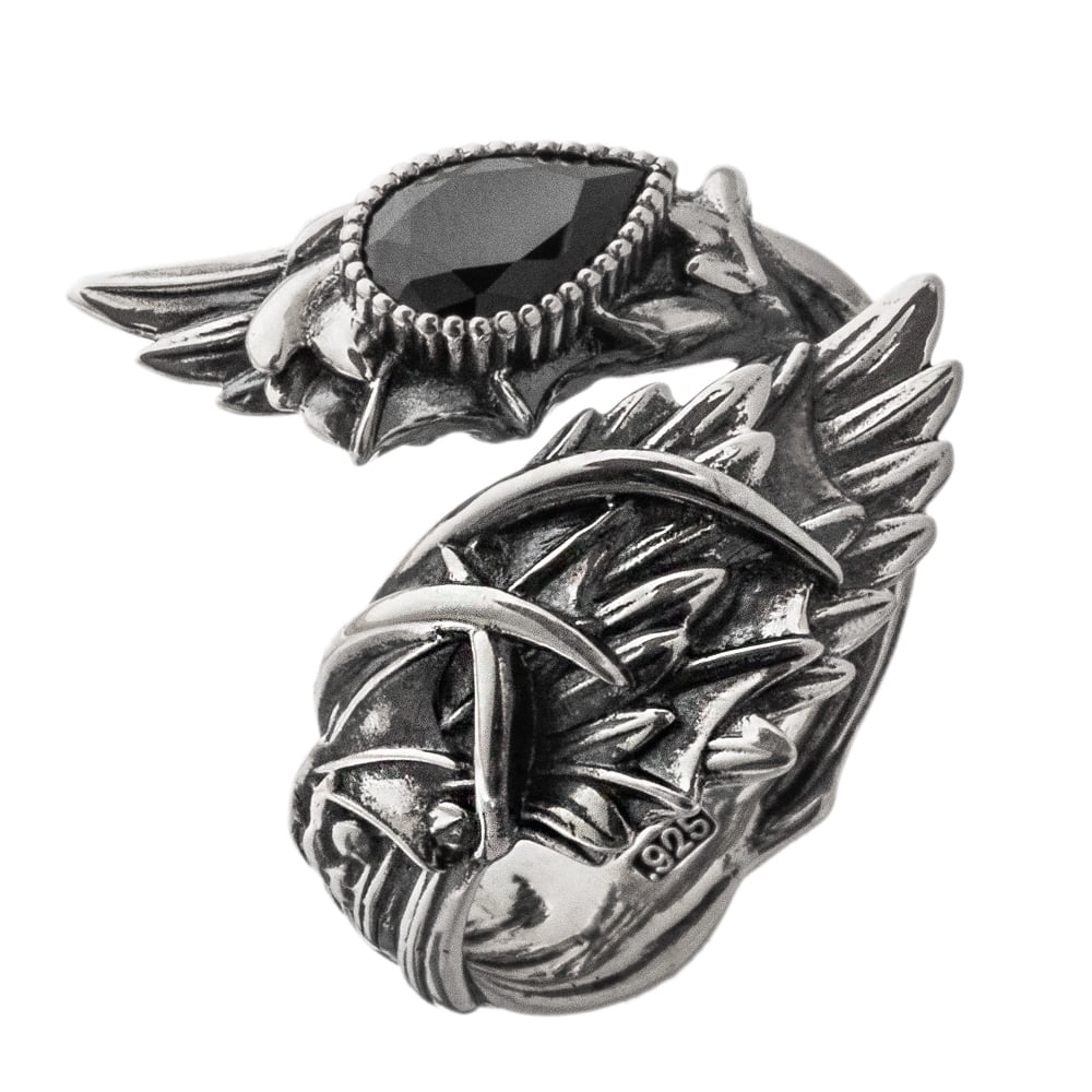 Two opposing wings, layered in motion. This avant-garde ring sets a pear-shaped black cubic zirconia at the crest, while tiered feather forms sweep around the finger. Each feather ridge is crisply carved; the interplay of polished sterling and subtle oxidization deepens the shadows and makes the sculptural relief stand out with every gesture.
