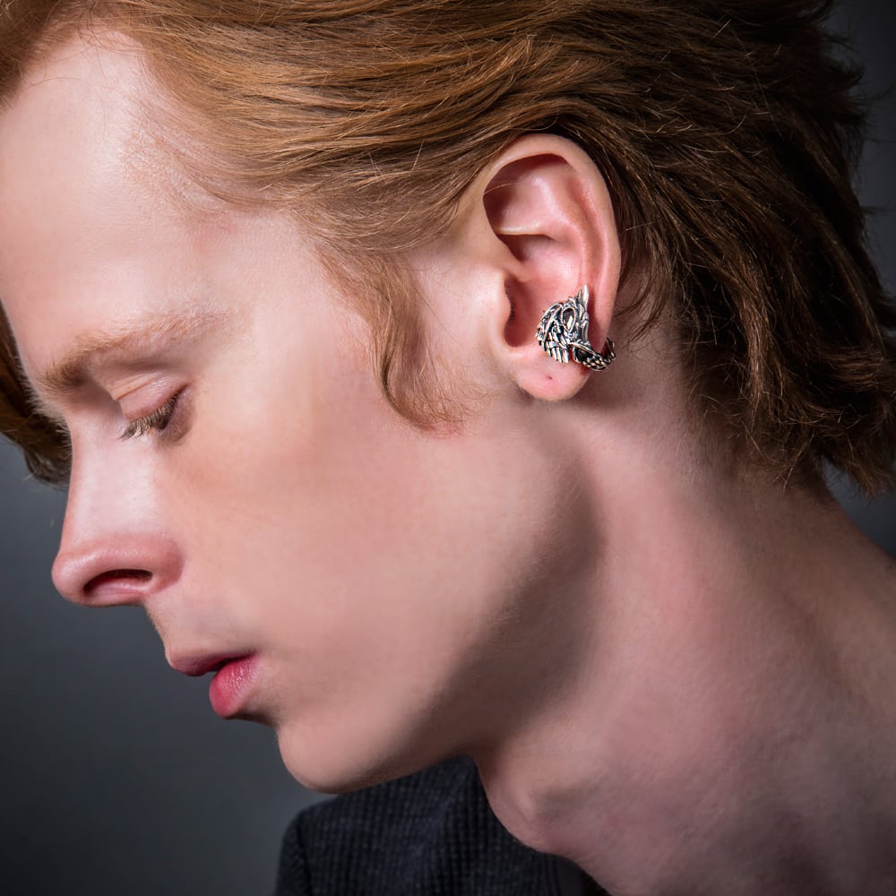 A sculptural ear cuff that sets “angel and devil” wings in stepped layers along the ear. Each feather is finely carved to catch the light, rising in graceful relief like flowing shadow and shine. A single black cubic zirconia at the center adds a sleek, lacquer-like gleam and a confident monochrome contrast by the face. No piercing required—just slip it on and it sits securely while lending a refined edge to any look. Cast in solid sterling silver and meticulously shaped, engraved, and hand-polished by atelier artisans for a smooth, comfortable fit. Wear it solo for a clean statement, or stack with pieces from the same series for a sharper, fashion-forward profile. Wings symbolize lift and ascent—this piece feels like a quiet push forward.