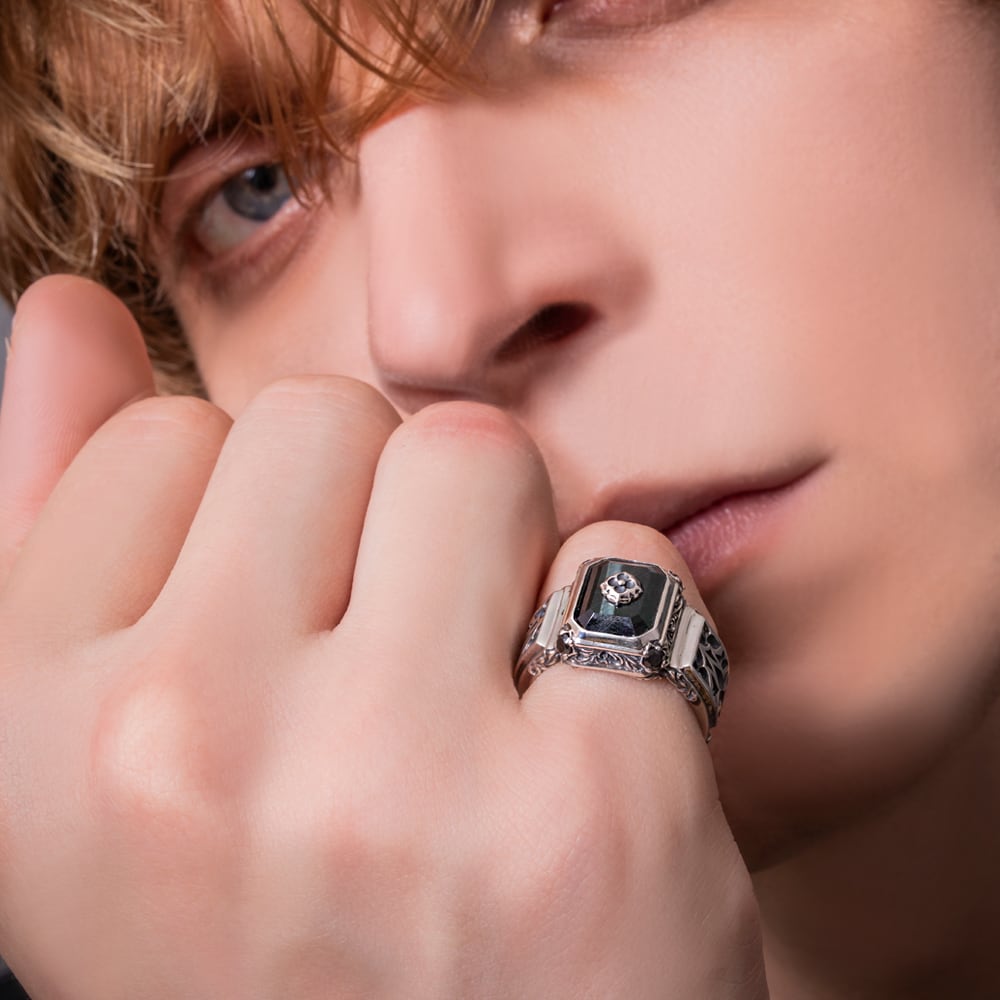 唐草とトレサリーを織り込んだ銀細工に、スクエアのブルータイガーアイを合わせた端正なリングです。黒に近い濃紺の石は、見る角度で虎目の縞が流れるように輝き、銀の艶と凛としたコントラストを描きます。リングサイドには繊細なトレサリーを、石座外周には緻密な唐草を彫り込み、細部まで陰影豊かに。裏面と石座センターにはトレサリーモチーフの細工を施し、石の奥行きを強調。内側は滑らかで着け心地も良好。モードにもストリートにも馴染み、単体でも重ね付けでも映える一本。ギフトにも最適。