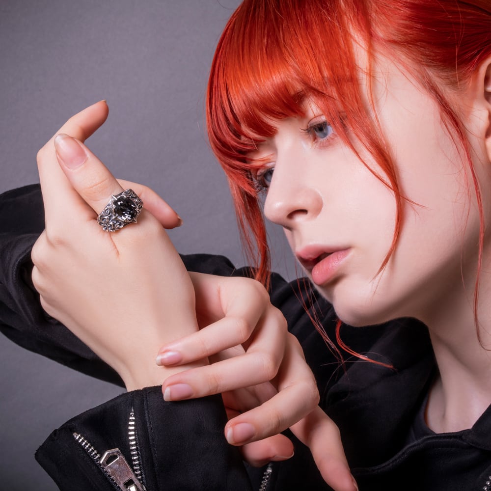 大粒のブラック・ミスティッククォーツを主役にした、フリーサイズのリングです。透明感のある深い黒石が魅力で、八方向に伸びる光条をイメージしたアウトラインと、シャープで細かな彫りがブランドらしさを際立てます。裏側は教会モチーフの透かし構造で光を取り込み、石の輝きをいっそう強く演出。指あたりの良い内側仕上げと、ほどよい重みで着け心地も快適。単体で手元を引き締め、モノトーンファッションやきれいめファッションにも好相性。他のブラックナイトシリーズとの重ね着けもおすすめ。背面にブランドロゴと「925」、BLACK KNIGHT刻印入り。