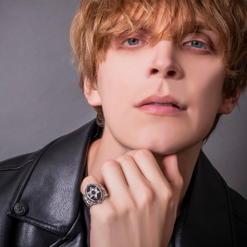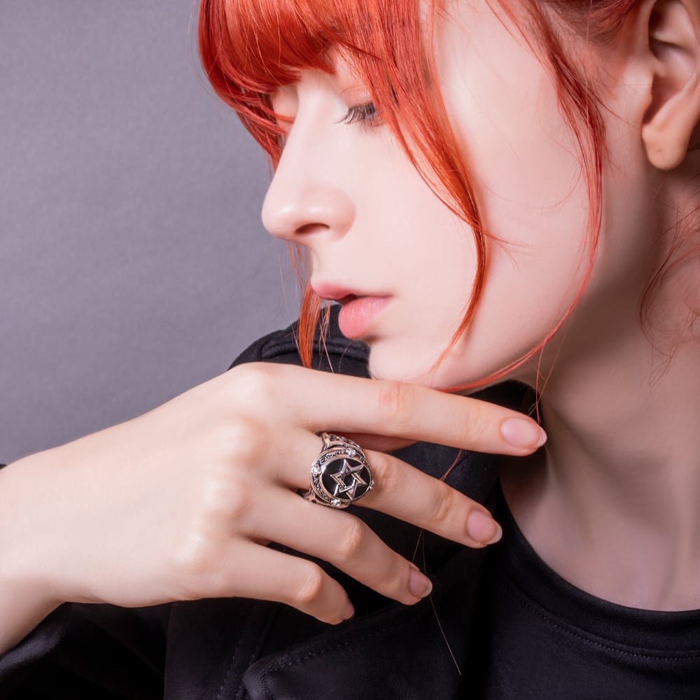漆黒の楕円石に浮かぶ六芒星が、堂々たる存在感を放つシグネットリング。トップには厚みのある六芒星を立体で配し、外周には繊細な唐草を一周。要所にあしらったクリアCZがほのかな輝きを添え、燻しを効かせたSV925が陰影豊かなコントラストを描きます。サイドは緻密なトレサリーの彫刻、内側にはブランドロゴと“925”、さらに教会文様のモチーフをデザイン。六芒星は天と地、物質と精神の調和を象徴し、古来より護符として敬愛されたシンボル。ブランド監修とクラフトを融合し、提携アトリエで完成させた渾身作です。ユニセックスに映えるバランスで、日常からドレススタイルまで。一本で装いの核となる、威厳とモードが同居するアートピース。