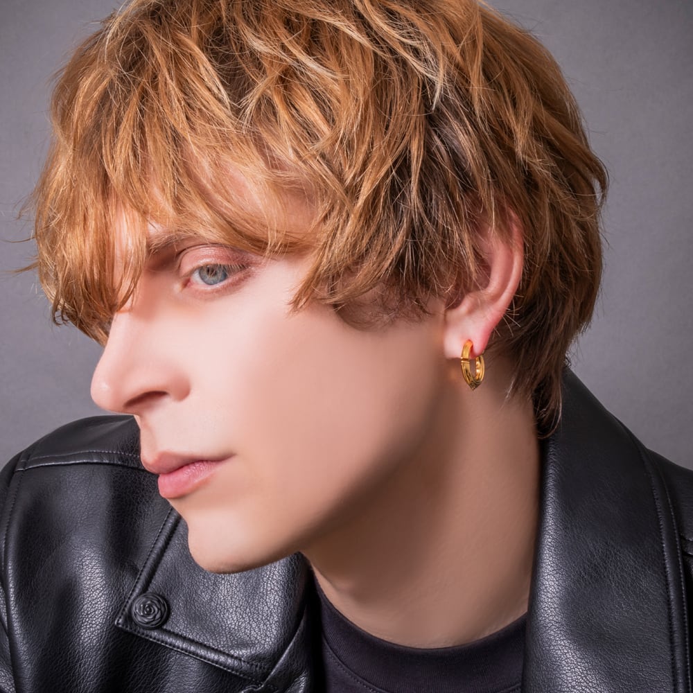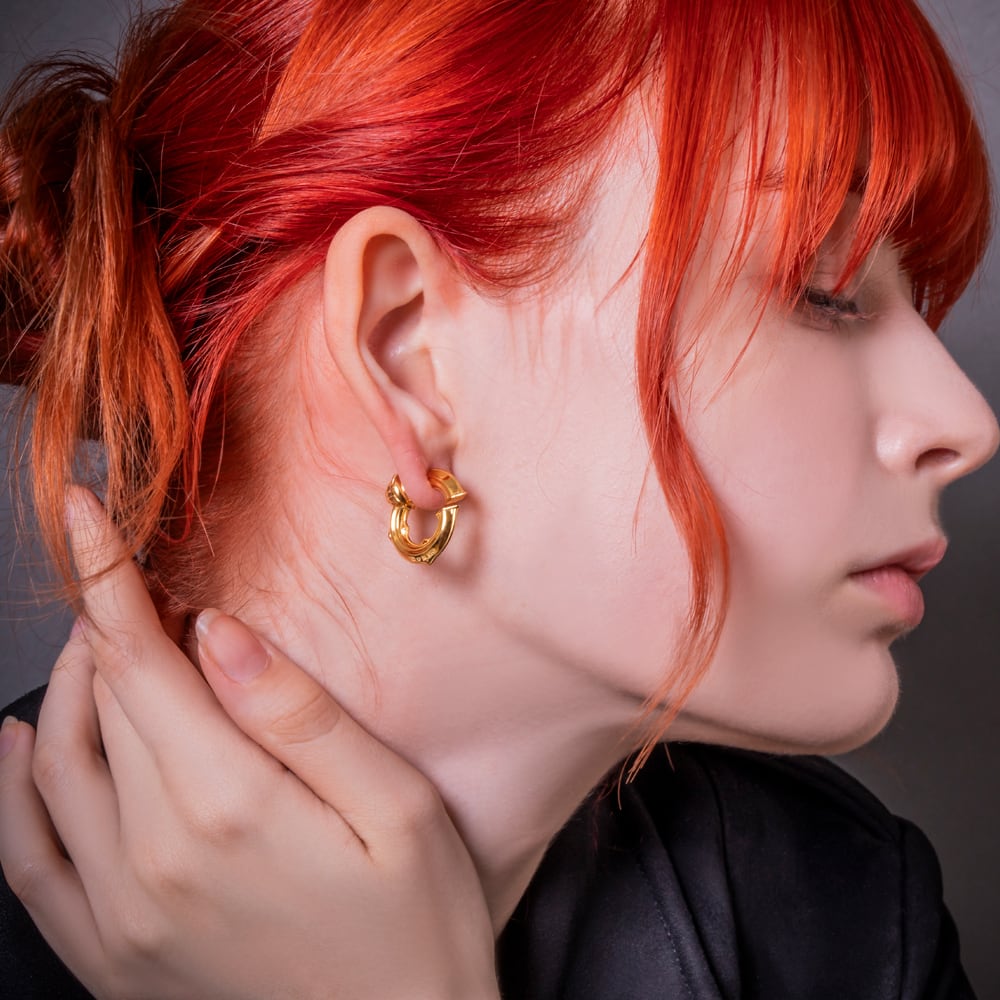 正面がぽっかり空いて見える、視線を奪うトリッキーなフープピアス。キャッチから造形が伸びてフープへとつながる立体構造で、角度によって表情が変わります。キャッチは可憐な花モチーフ、フープはシンプルかつレイヤード感のあるトレサリーデザイン。全体にK10メッキを施し、上質な艶とあたたかなゴールドの輝きをプラスしました。耳元にちょうどいいボリュームで着け心地は軽やか。カジュアルからきれいめまで幅広く馴染み、単体はもちろん左右アシンメトリーのアレンジにも好相性です。フープにはブランドロゴと「925」の品質刻印に加え、サークル王冠・シールドライオン・スクエアJPの3種ホールマークスタンプを刻印。細部までこだわりが息づく一本です。